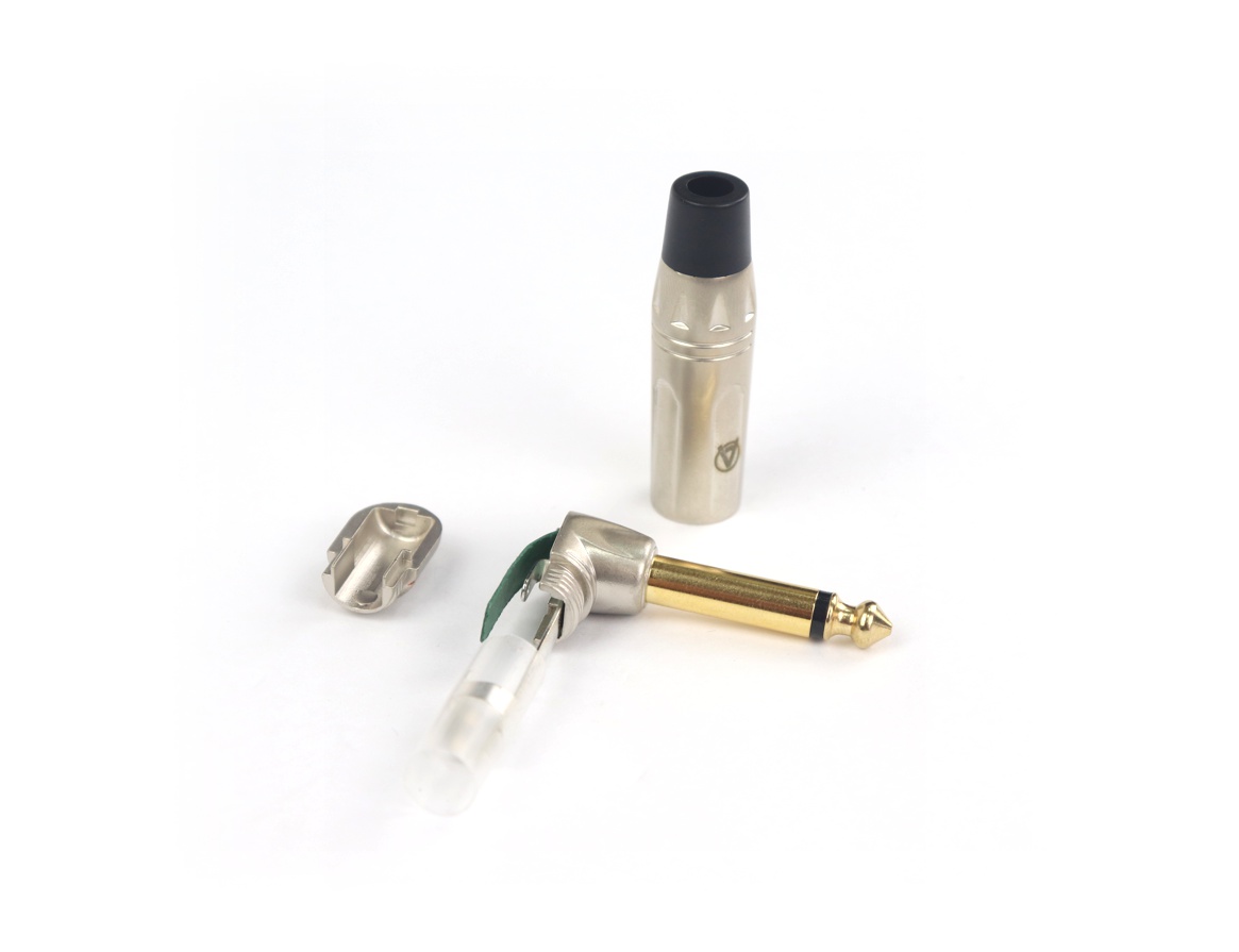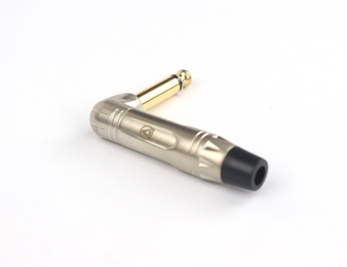 AuraSonics JMA2R-G - это угловой моно разъем Jack размером 6.3 мм TS, штекер. Используется для распайки инструментальных или небалансных межблочных акустических кабелей.