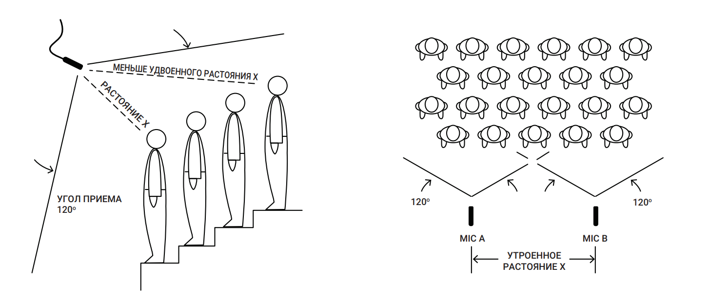 Монтаж подвесной, перед самым ближним и выше самого дальнего от микрофона источника звука, головка микрофона направляется между ближним и дальним источниками примерно по центру (см. схему). Угол наклона регулируется для достижения наиболее сбалансированного снятия звука.
