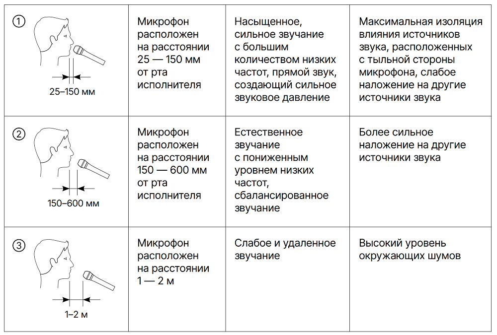 За счет конструкции и акустических характеристик прибор имеет низкую чувствительность к окружающим звукам и фокусируется на голосе (или музыкальном инструменте). Это позволяет не обращать внимание на размеры и акустические особенности помещения или наличие боковых/тыльных фоновых шумов, в том числе уличных.