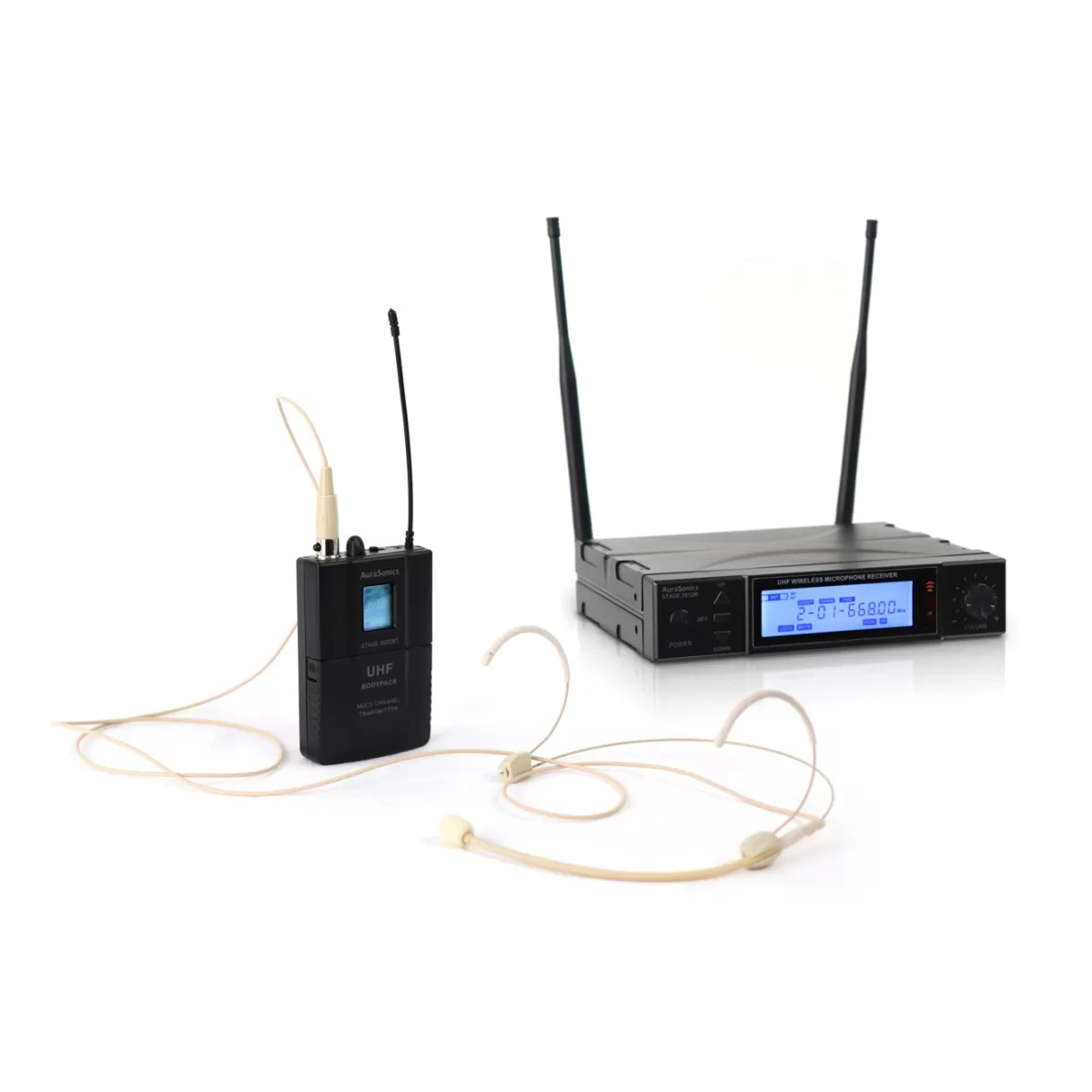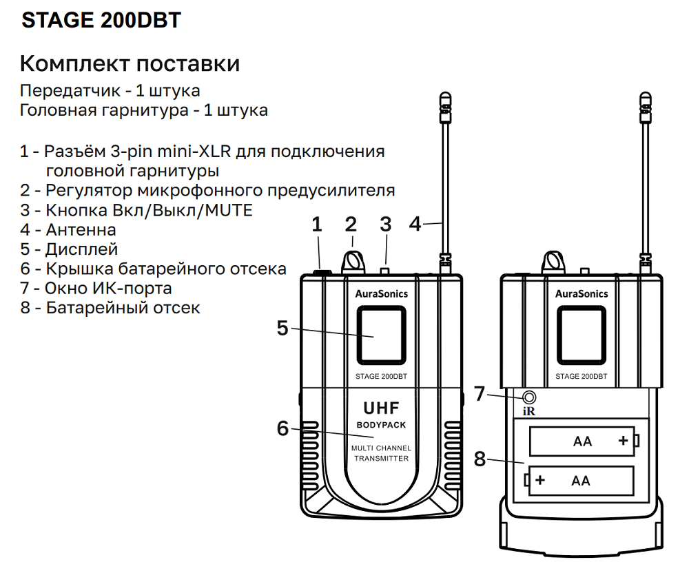 На лицевой части передатчика STAGE 200DBT находится LCD-дисплей и кнопка активации/отключения звука. Есть антенна. Максимальное расстояние между передатчиком и приемником составляет 80 метров, при условии прямой видимости и мощности 10 мВт. Головная гарнитура имеет телесный цвет, чтобы быть незаметной в видеокадре. Микрофон с электретным капсюлем и высокой чувствительностью. Программирование работы устройства от приемника через ИК-порт (в отсеке для батареек).