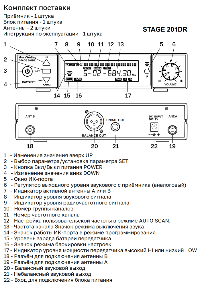 Одноканальный приёмник AuraSonics STAGE 201DR является базовым компонентом цифровой радиосистемы STAGE. Обеспечивает надежный прием аудиосигнала от передатчиков STAGE 200DHT или STAGE 200DBT. Несущие частоты обмена данными 660 - 690 МГц, диапазон разделён на десять (10) групп, каждая из которых содержит двадцать (20) заранее настроенных радиоканалов с шагом в 100 кГц. При реализации функции поиска свободной частоты соответствующими кнопками, шаг также составляет 100 кГц. Для помехозащищенности применена модуляция 4DQPSK.