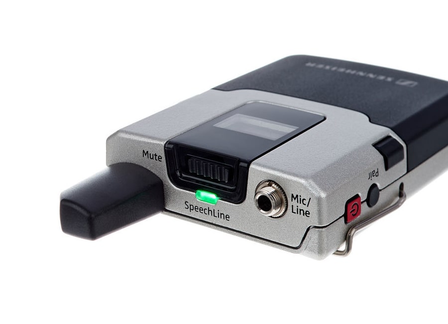 Поясной передатчик системы оснащен цифровым информативным дисплеем, оборудован стандартным входом типа mini-Jack, гибкой антенной и питается от двух пальчиковых батарей типа АА, либо аккумуляторной батареи BA 30.