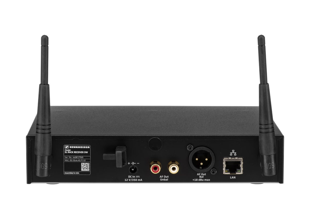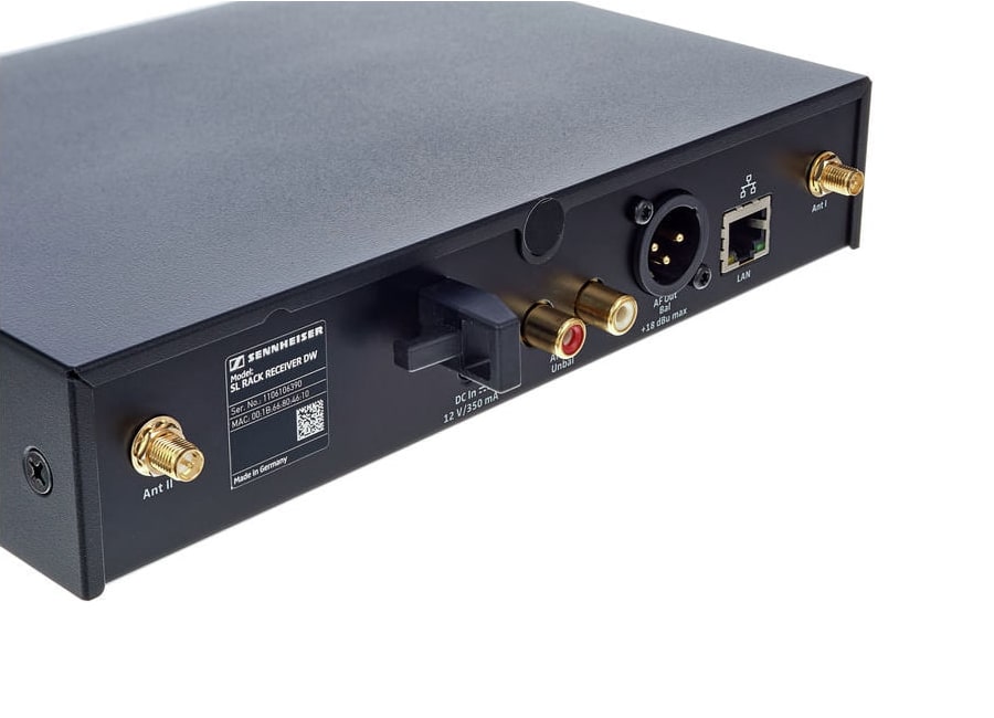 Стационарный приемник системы оснащен всеми необходимыми органами управления и большим информативным дисплеем, на котором отображается вся необходимая информация о текущем режиме работы системы. Имеет встроенную обработку аудиосигнала в виде 7-полосного графического эквалайзера, High Pass фильтра и прочих аудио прессетов. Аудиовыходы приемника выполнены в виде двух стандартных портов: одного балансного XLR и двух небалансных RCA. Так же, приемник имеет два антенных входа типа SMA с винтовыми зажимами. Плюс ко всему, в нем имеется сетевой порт RJ45. Питание приемника осуществляется от внешнего сетевого адаптера (блока питания), который входит в комплект поставки.