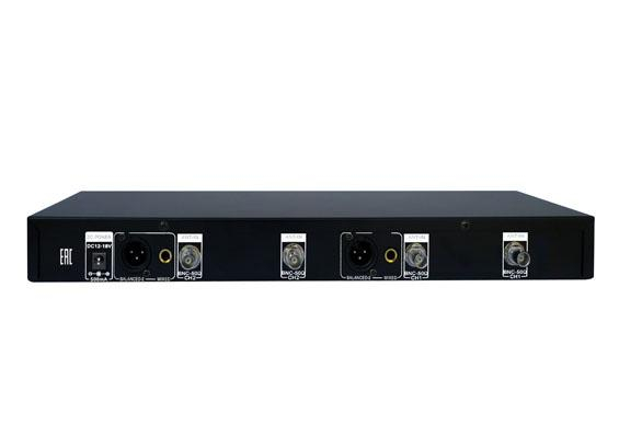 Аудиовыходы приемника представлены двумя балансными разъемами XLR по которым передаются независимые сигналы от каждого из радиопередатчиков и двумя небалансными Jack для вывода микшированного сигнала. Для оптимальной передачи голоса рекомендуется использовать балансный выход, тогда как коннектор Jack применять как резервный и тестовый. Синхронизация приемника и передатчиков производится автоматически с помощью ИК-портов.