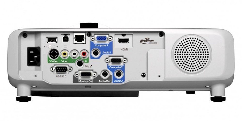 Что же касается подключения, то EB-520 оснащен большим количеством органов приема-передачи как аналогового, так и цифрового сигналов. Вход видеосигнала осуществляется при помощи традиционного RCA, S-Video, высококачественного HDMI, а также двух компьютерных портов VGA, которые в свою очередь сопровождаются стереофоническими аудиовходами mini-Jack. Также проектор позволяет выводить видеосигнал на контрольный монитор через VGA-Out и аудиосигнал на внешнюю акустическую систему через выход mini-Jack. Плюс ко всему, прибор имеет два цифровых интерфейса USB-A/USB-B и поддерживает подключение к сети интернет. Дополнительно имеется микрофонный вход mini-Jack и встроенный громкоговоритель мощностью 16 Вт.