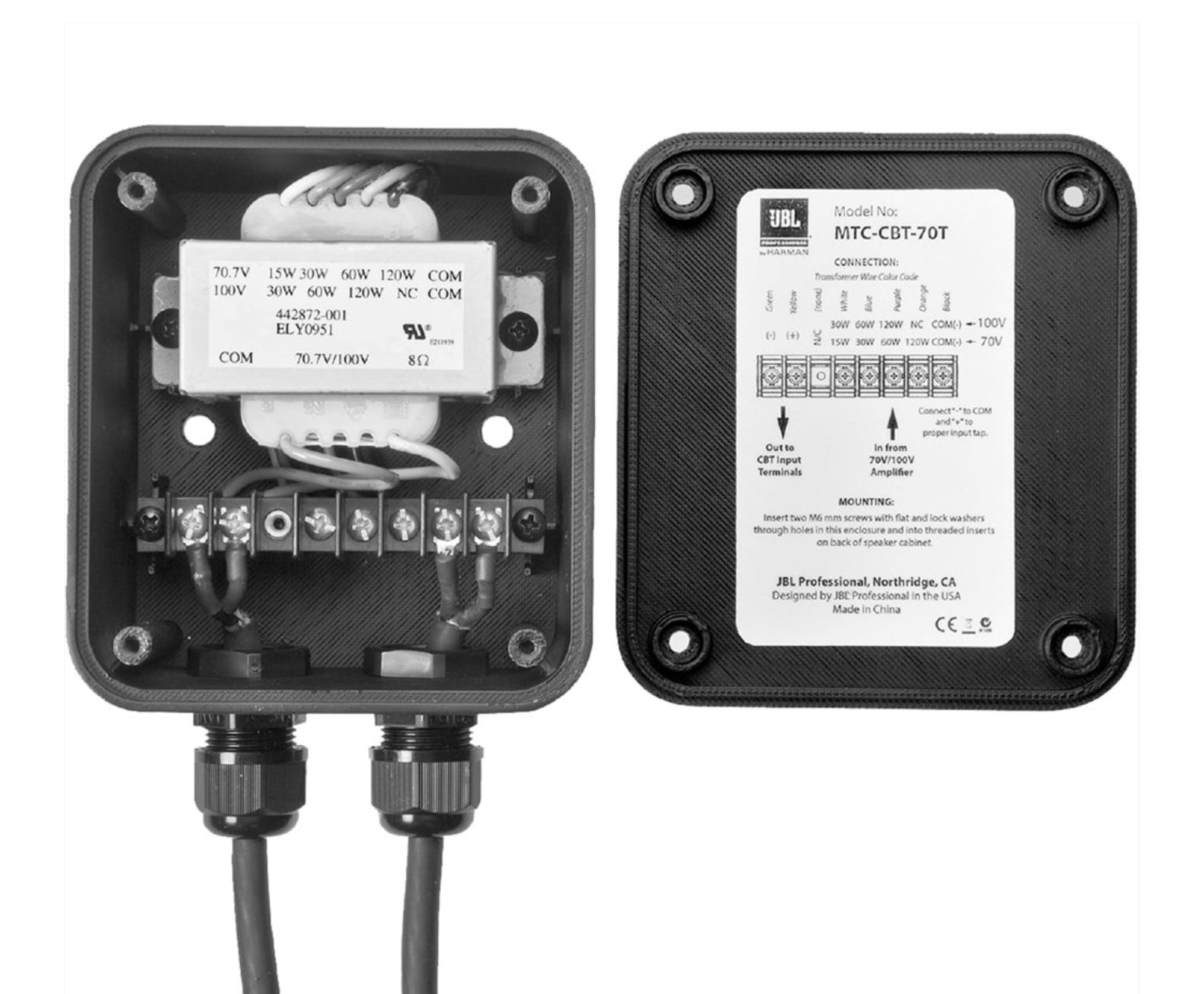 JBL MTC-CBT-70T - представляет собой трансформаторный модуль, предназначенный для оптимизации низкоомных акустических систем к работе в высоковольтных линиях - 100 и 70 вольт. Прежде всего данный модуль предназначен для работы с акустическими системами таких моделей, как: CBT 70J-1 / CBT 70J-1 WH / CBT 70JE-1 / CBT 70JE-1 WH. Вместе с тем, он вполне может работать и с другими акустическими системами различных производителей. Модуль выполнен из прочного ABS пластика, армированного стекловолокном. Имеет класс защиты IP-55 согласно IEC529, благодаря чему устойчив к ультрафиолетовому излучению, влаге и солевым туманам. Данный модуль доступен в двух цветовых исполнениях: черном и белом.