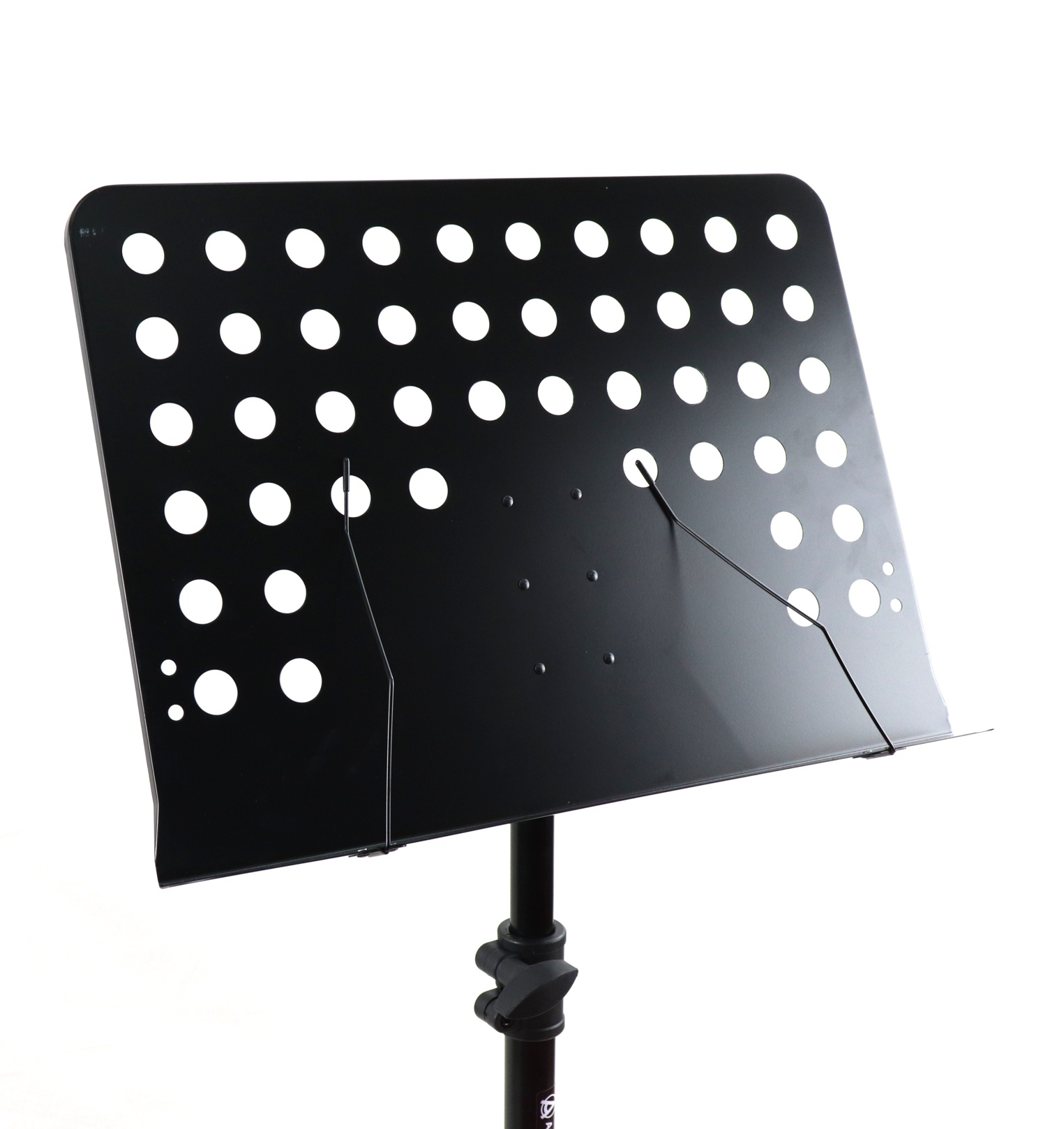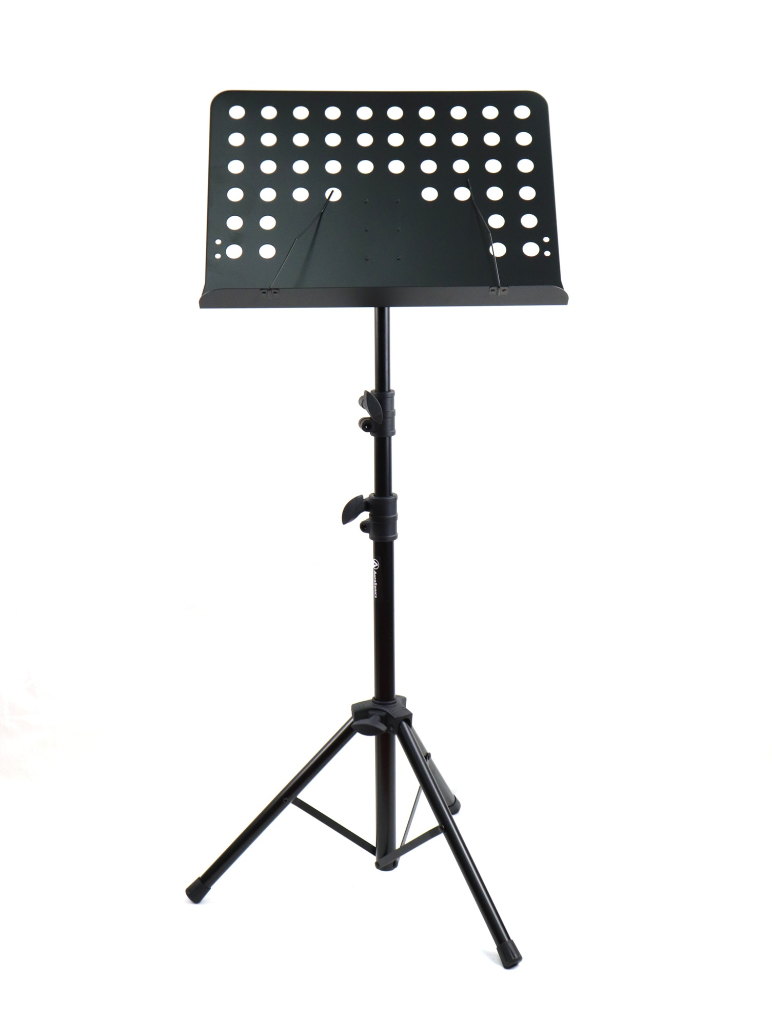 Установлен на треноге и оснащён большой нотной площадкой (размеры 48 х 35 см), которая для облегчения веса создана перфорированной. Предусмотрено два (2) нотных фиксатора. Высота регулируется в пределах от 80 см до 180 см. Прочная стальная конструкция черного цвета может легко складываться для удобной транспортировки.