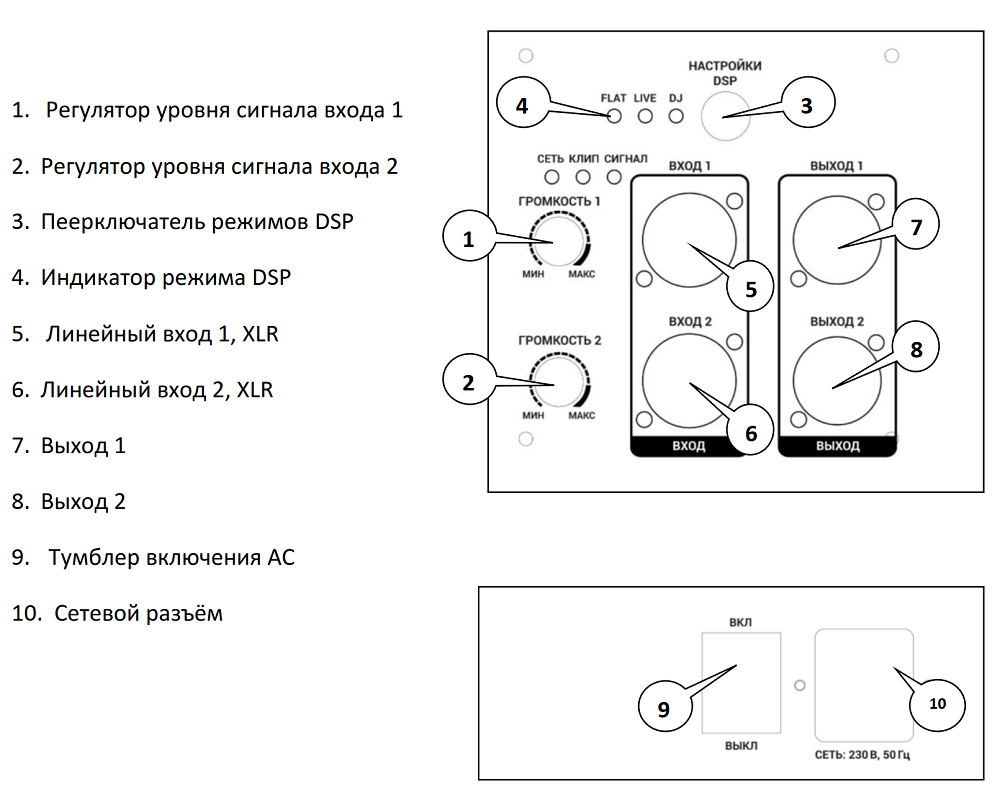 Встроенный микшер, два линейных входных канала, разъемы XLR; два линейных аудиовыхода, разъемы XLR, к ним подключаются следующие по цепочке АС. Коннекторы размещены на тыльной части корпуса, здесь же элементы управления: у каждого входа регулятор громкости и переключатель пресетов DSP. Светодиодная индикация: наличие питания и сигнала, перегрузка, а также текущий выбранный пресет. Если комплект включает в себя активный сабвуфер AMADEUS, то источник сигнала рекомендуется подключать к нему, а с его выхода подавать сигнал на АС.