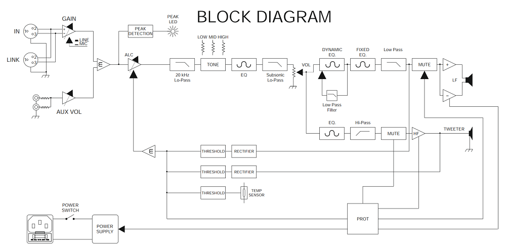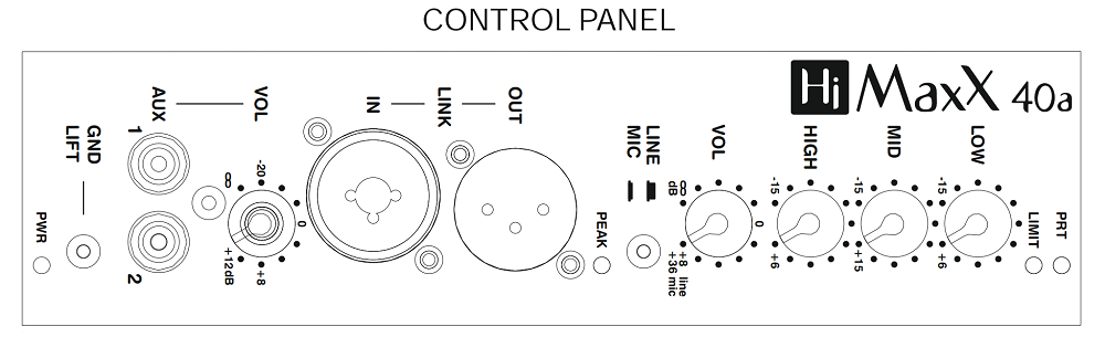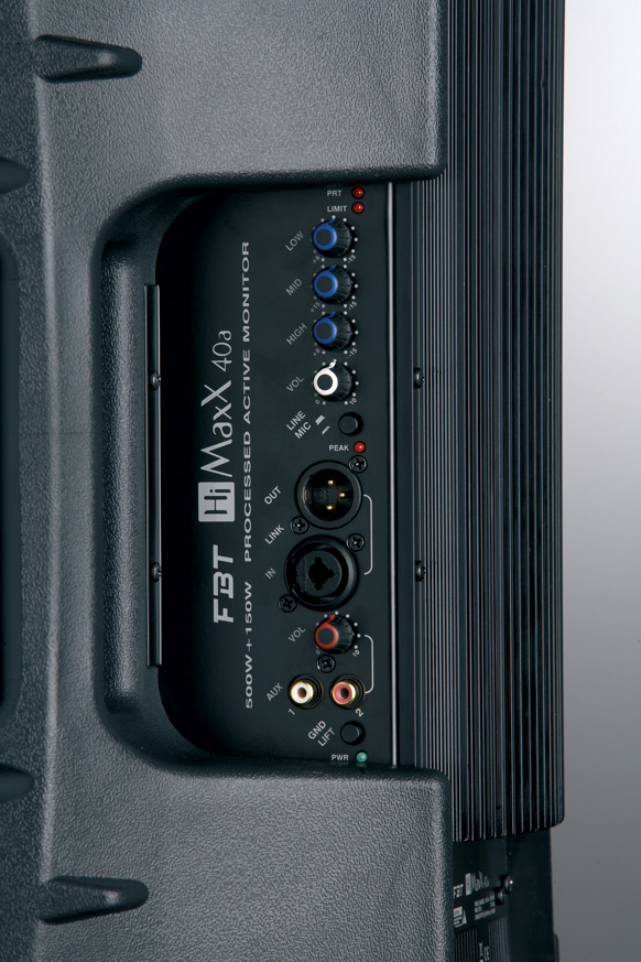 Оснащение HiMaxX 40A. Два (2) динамика: ВЧ-драйвер с неодимовым магнитом диаметром 1,7" (B&C custom) и НЧ-вуфер с неодимовым магнитом диаметром двенадцать дюймов (12") со звуковой катушкой 3" (B&C custom). Два (2) усилителя: для НЧ-динамика класса D с мощностью (RMS) 1000 Вт; для ВЧ класса G и мощностью (RMS) 250 Вт. Аналоговый процессор обработки звука с лимитером. Трехполосный эквалайзер - НЧ, ВЧ и СЧ. Предусмотрена регулировка громкости. Аудиовходы представлены несколькими типами: 1 combo XLR/Jack, 1 XLR-link и 2 независимых канала (XLR/Jack, L/R Cinch RCA) для подключения внешних MP3, CD или PC плееров.