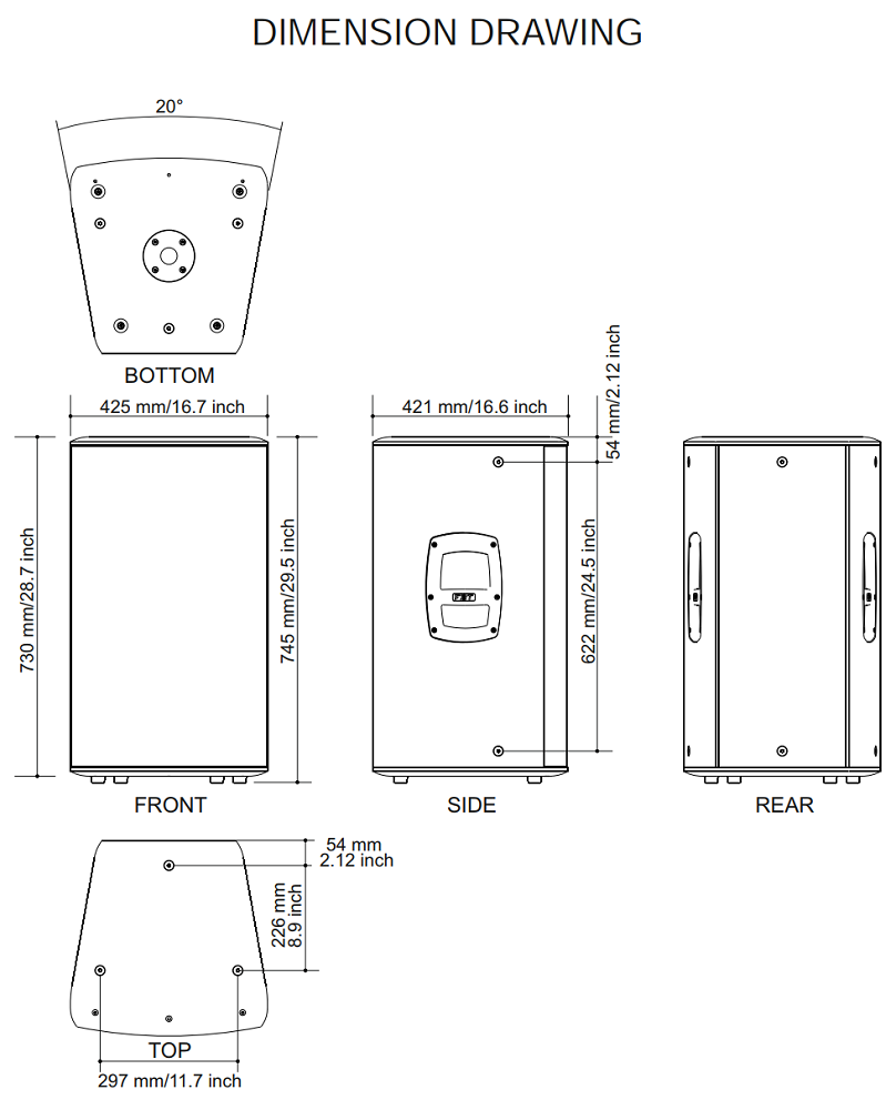 Корпус выполнен из многослойной фанеры балтийской березы толщиной 15 мм, стальная решетка с порошковым окрасом защищает лицевую часть. На тыльной стороне расположены коннекторы 2х XLR "с петлей" и элементы управления функциями DSP. Габаритные размеры 425х750х421 мм, вес 26 кг. Монтаж настенный (есть точки крепления М10), напольный, включая положение "на бок" (под углом 45°, сценический монитор) или на акустические стойки. Для удобства переноса предусмотрены ручки. Питание AC 220В. Черный цвет.