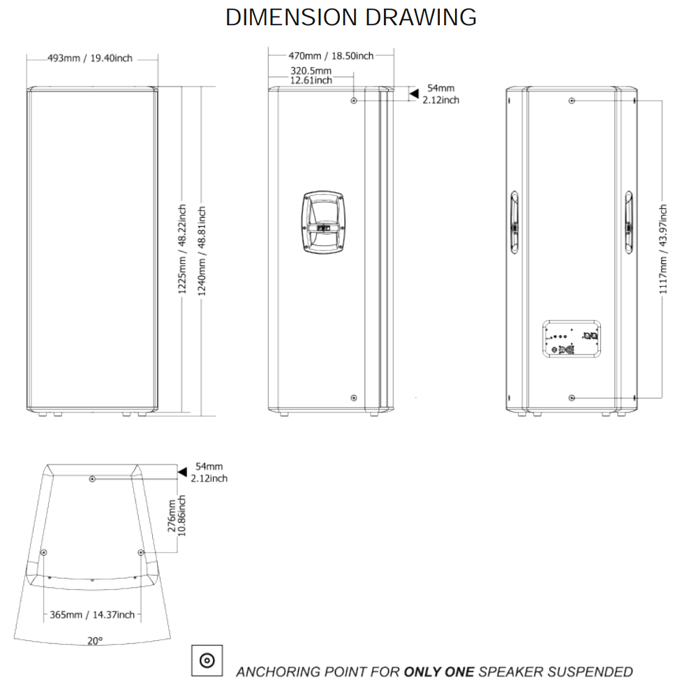 Корпус выполнен из многослойной фанеры балтийской березы толщиной 15 мм, стальная решетка с порошковым окрасом защищает лицевую часть. На тыльной стороне расположены коннекторы 2х XLR "с петлей" и элементы управления функциями DSP. Габаритные размеры 493х1245х471 мм, вес 52,5 кг. Монтаж настенный (есть точки крепления М10), напольный, включая положение "на бок" (под углом 40-60°, сценический монитор) или на акустические стойки. Для переноса предусмотрены ручки. Черный цвет.