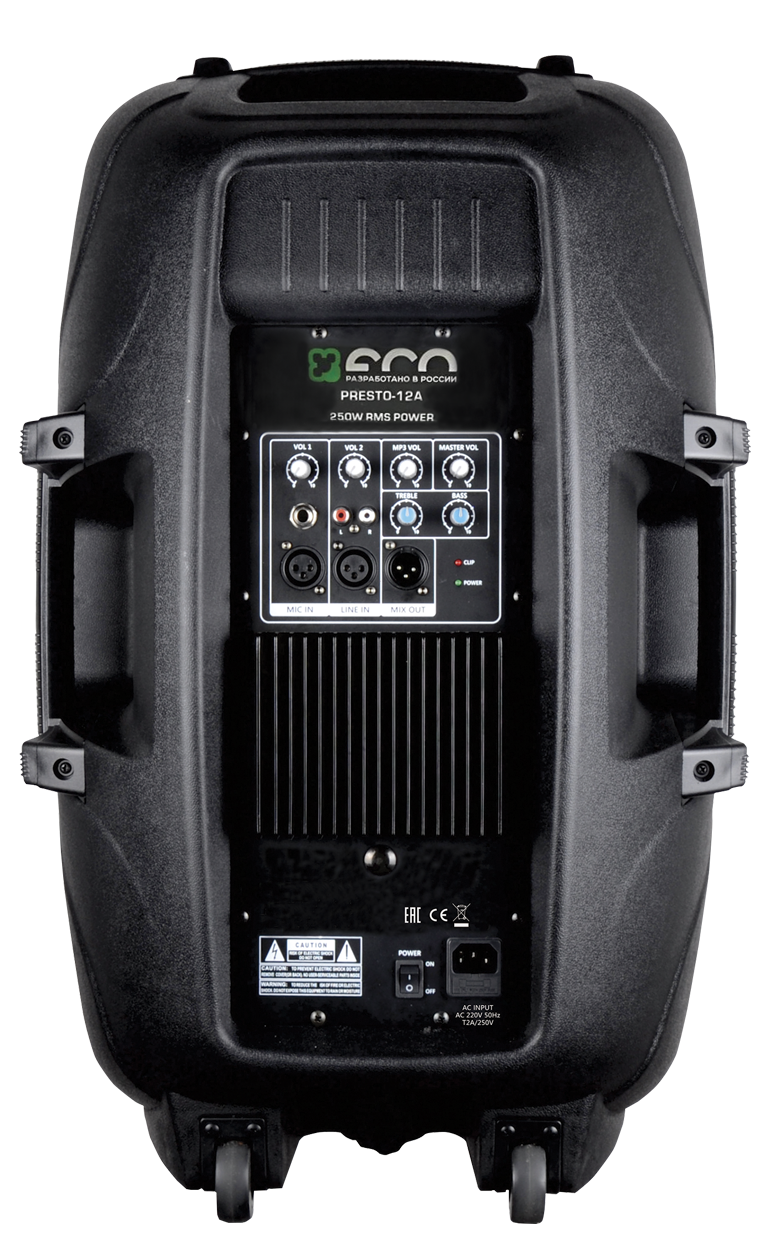 Встроенный микшер, два входных канала: комбинированный, микрофонно-линейный, разъемы XLR и Jack 6.3 мм; линейный, разъемы XLR и RCA. Линейный аудиовыход с микшированным сигналом, разъем XLR, к нему подключаются следующая по цепочке АС. Коннекторы размещены на тыльной части корпуса, здесь же элементы управления: для каждого входа независимый регулятор громкости, общий регулятор громкости и отдельный регулятор громкости для MP3 файлов. Двухполосный эквалайзер, отдельно настраиваются НЧ и ВЧ составляющие сигнала. Если комплект включает в себя активный сабвуфер PRESTO, то источник сигнала рекомендуется подключать к нему, а с его выхода подавать сигнал на АС.