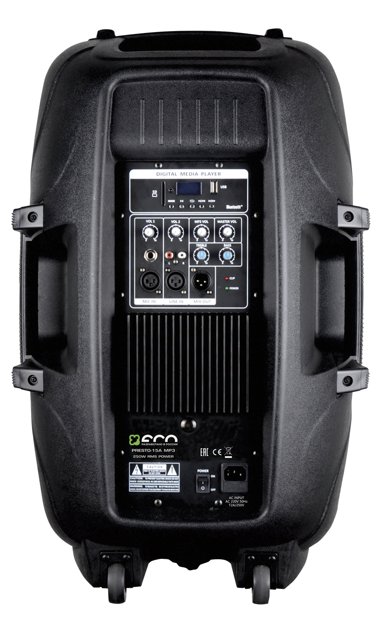 Встроенный микшер, два входных канала: комбинированный, микрофонно-линейный, разъемы XLR и Jack 6.3 мм; линейный, разъемы XLR и RCA. Линейный аудиовыход с микшированным сигналом, разъем XLR, к нему подключаются следующая по цепочке АС. Коннекторы размещены на тыльной части корпуса, здесь же элементы управления: для каждого входа независимый регулятор громкости, общий регулятор громкости и отдельный регулятор громкости для MP3 файлов. Двухполосный эквалайзер, отдельно настраиваются НЧ и ВЧ составляющие сигнала. Если комплект включает в себя активный сабвуфер PRESTO, то источник сигнала рекомендуется подключать к нему, а с его выхода подавать сигнал на АС.