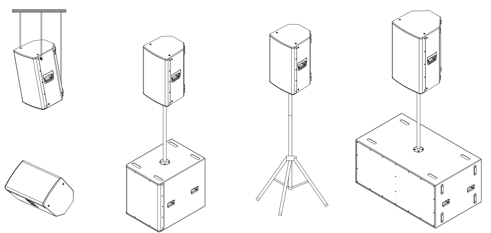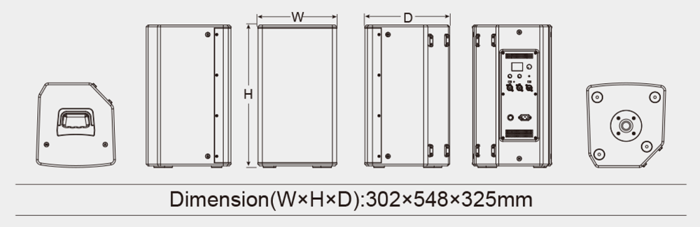 Динамики защищены сплошной стальной перфорированной сеткой. Корпус выполнен из фанеры. Внизу корпуса расположен стакан под стандартные стойки-треноги Ø 35мм, а на задней части есть отверстия М8 для подвеса. Также АС можно монтировать на кронштейн и применять как сценический монитор, размещая напольно под углом 45 градусов. По бокам есть ручки для переноса.