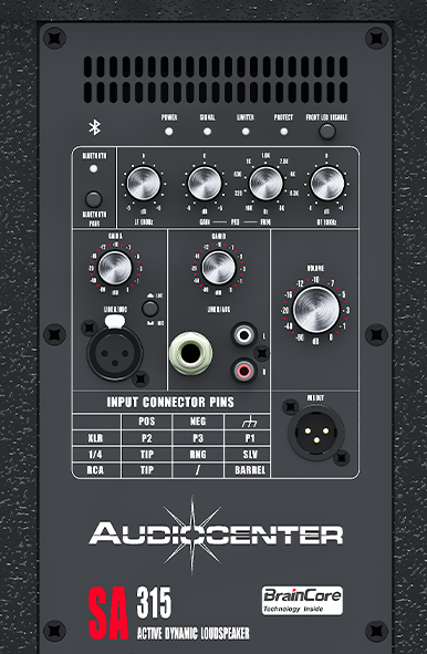 Акустическая система SA315 обеспечивает стабильную частотную характеристику на уровне -10 дБ в диапазоне 44 Гц - 20 кГц и способна выдать пиковое звуковое давление 132 дБ. На задней панели устройства предусмотрены элементы управления, которые включают в себя независимую регулировку усиления для каждого входного канала + общую регулировку громкости трансляции. Прибор надежно защищен от перегрева, перегрузок на входе/выходе, короткого замыкания, постоянного тока, перенапряжения или его недостатка.