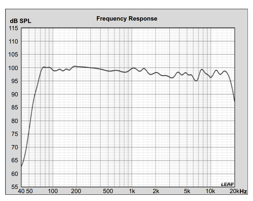 Прибор оснащен следующими динамиками: высокопроизводительный низкочастотный вуфер 12 дюймов с неодимовым магнитос; высокочастотный однодюймовый компрессионный драйвер. Динамики расположены коаксиальным способом (один в другой). Также встроены усилитель класса D и DSP-процессор (4 предустановленных пресета). Усиление организовано по принципу би-амп: мощность выделяемая на НЧ-составляющую = 400 Вт (max RMS), а на НЧ динамик приходится 100 Вт (max RMS). АЦП процессора: 24-бит, 48 кГц. Уровень звукового давления на расстоянии 1 метра от прибора составляет 130 дБ. Рабочий диапазон частот 60 – 20 000 Гц по уровню -6 дБ. Рупор обеспечивает диаграмму направленности 90° в обоих плоскостях.