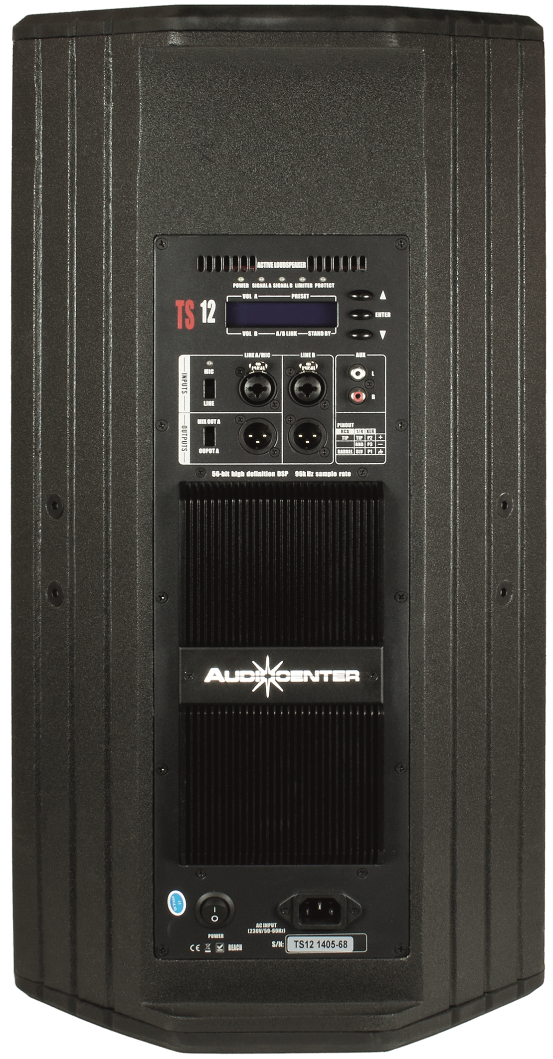 TS12 – это профессиональная активная двухполосная акустическая система производства компании AUDIOCENTER. Она представлена в сегменте бюджетного звукового оборудования, имеет отличное качество звучания, разработана с использованием высококачественных материалов и выделяется высокой технологичностью, гибкостью и надежностью. Благодаря встроенному усилителю D класса с выходной мощностью 1200 Вт и двум динамикам (12" низкочастотному и 1" высокочастотному), система обеспечивает хорошую громкость с максимальным звуковым давлением 131 дБ в диапазоне рабочих частот от 45 Гц до 20 кГц. За обработку звука и точность настройки отвечает 56 битный цифровой DSP процессор, который обрабатывает входной сигнал, поступающий на встроенный двухканальный микшер. Также имеется кроссовер, который выделяет весь частотный спектр входного сигнала (низкие, средние, высокие частоты) и обеспечивает максимально естественное звучание акустической системы. Дополнительно предусмотрена система мягкого пуска, защита от перегрева, перегрузки, КЗ, постоянного тока и скачков напряжения. Все компоненты акустической системы защищены прочным корпусом из многослойной березовой фанеры. На передней панели имеется металлическая решетка, защищающая динамики от механических повреждений. Сам корпус имеет трапецеидальную форму, оборудован 35 мм стаканом для акустической стойки, специальными отверстиями типа М8 для возможности подвеса и эргономичными ручками для удобства транспортировки.
