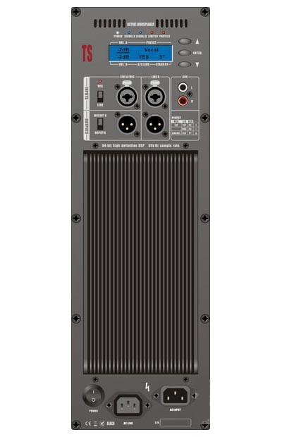 TS15 – это профессиональная активная двухполосная акустическая система производства компании AUDIOCENTER. Она представлена в сегменте бюджетного звукового оборудования, имеет отличное качество звучания, разработана с использованием высококачественных материалов и выделяется высокой технологичностью, гибкостью и надежностью. Благодаря встроенному усилителю D класса с выходной мощностью 1200 Вт и двум динамикам (15" низкочастотному и 1" высокочастотному), система обеспечивает хорошую громкость с максимальным звуковым давлением 133 дБ в диапазоне рабочих частот от 40 Гц до 20 кГц. За обработку звука и точность настройки отвечает 56 битный цифровой DSP процессор, который обрабатывает входной сигнал, поступающий на встроенный двухканальный микшер. Также имеется кроссовер, который выделяет весь частотный спектр входного сигнала (низкие, средние, высокие частоты) и обеспечивает максимально естественное звучание акустической системы. Дополнительно предусмотрена система мягкого пуска, защита от перегрева, перегрузки, КЗ, постоянного тока и скачков напряжения. Все компоненты акустической системы защищены прочным корпусом из многослойной березовой фанеры. На передней панели имеется металлическая решетка, защищающая динамики от механических повреждений. Сам корпус имеет трапецеидальную форму, оборудован 35 мм стаканом для акустической стойки, специальными отверстиями типа М8 для возможности подвеса и эргономичными ручками для удобства транспортировки.