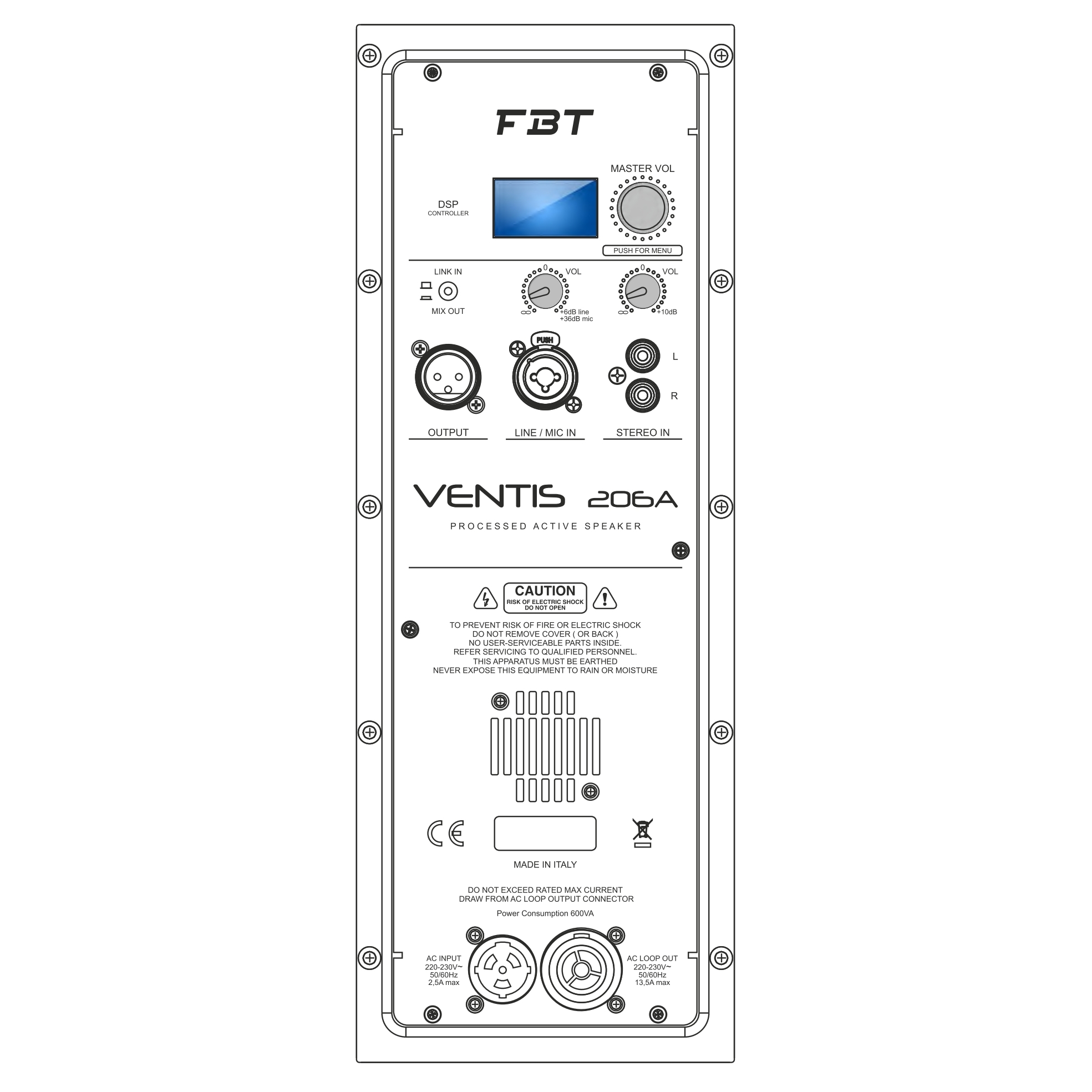 Оснащение VENTIS 206A. Три (3) динамика: ВЧ-драйвер диаметром 1,4" (B&C custom) и два НЧ-вуфера, каждый диаметром шесть с половиной дюймов (6,5") со звуковой катушкой 1,5" (B&C custom). Два (2) усилителя: для НЧ-динамика класса D с мощностью (RMS) 700 Вт; для ВЧ класса H и мощностью (RMS) 200 Вт. Цифровой процессор обработки звука DSP с шестью пресетами. Трехполосный эквалайзер - НЧ, ВЧ и СЧ. Предусмотрена регулировка громкости. Аудиовходы представлены несколькими типами: 1 combo XLR/Jack, 1 XLR-M и 1 RCA st