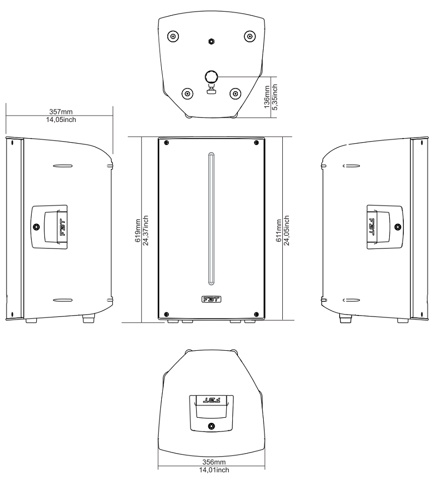 Корпус из полипропилена (пластик), стальная решетка с порошковым окрасом черного цвета защищает лицевую часть. Габаритные размеры 356х619х357 мм, вес 16,3 кг. Монтаж настенный (4 точки М10 для подвеса), на акустическую стойку 35 мм (стакан) или напольный, включая положение "на бок" (под углами 30 или 45°, сценический монитор). Питание AC 220В. Для удобства переноса предусмотрены ручки.