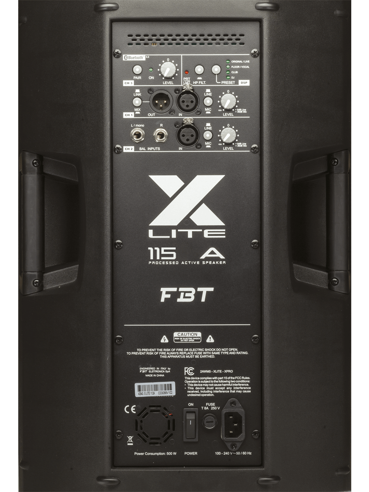 Оснащение X-LITE 115A. Два (2) динамика: ВЧ-драйвер диаметром 1,4" и НЧ-вуфер диаметром пятнадцать дюймов (12") со звуковой катушкой 2,5" (B&C custom). Bi-amp усиление класса D, мощность (RMS): 1200 Вт у НЧ составляющей и 300 Вт на ВЧ. Цифровой процессор обработки звука DSP с четырьмя пресетами, ФВЧ. Трехканальный микшер: аудиовходы 2х XLR и 1х Jack TRS (стерео), аудиовыход 1х XLR. Для беспроводного подключения через модуль Bluetooth (версия 5.0) предусмотрен выделенный канал. На тыльную сторону корпуса вынесены коннекторы и элементы управления: регуляторы громкости, селектор пресетов, переключатель каналов ch1/mix.