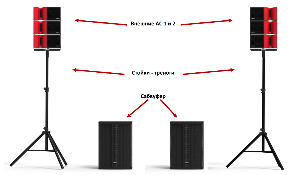 | Динамик каждого сабвуфера: | 15”, катушка 3”, сопротивление 4 Ом |
