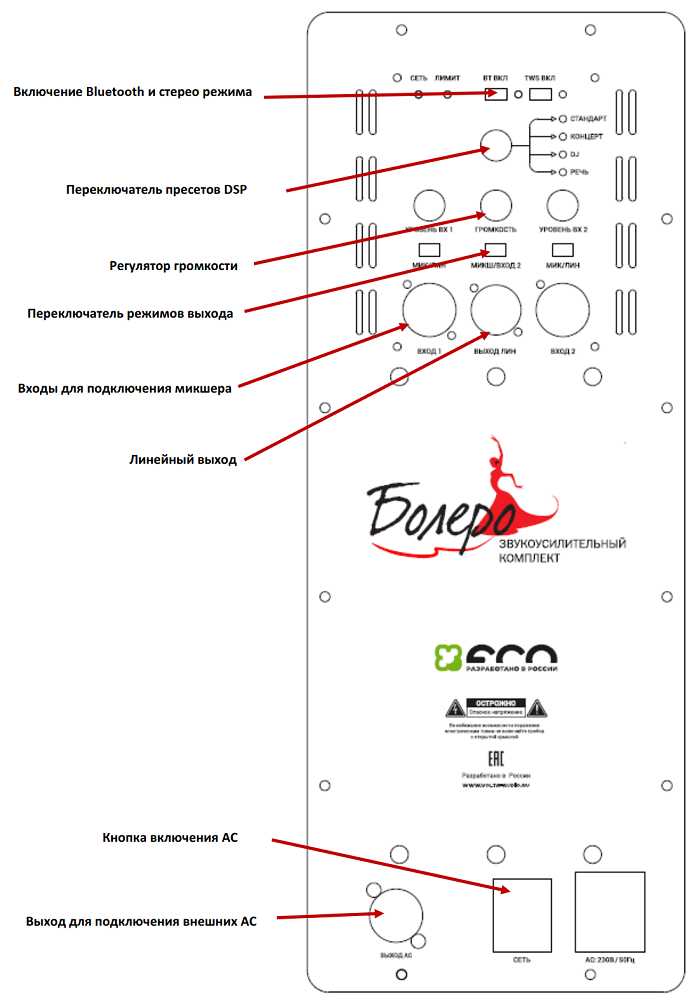 Стильный, современный дизайн приборов в комплекте БОЛЕРО подходит для самых притязательных артистов и организаторов концертов. Корпус приборов изготовлен из высококлассного пластика, динамики защищены алюминиевой сеткой, акустические стойки из металла. Масса комплекта в сборе 86,3 кг. Монтаж напольный, причем АС можно устанавливать как на стойки-треноги, так и непосредственно на сабвуфер, путем несложной их трансформации в стойки саб/сат. Питание сабвуферов от сети 220В. Широкополосные АС окрашены в черно-красный цвет, а сабвуферы полностью черные.