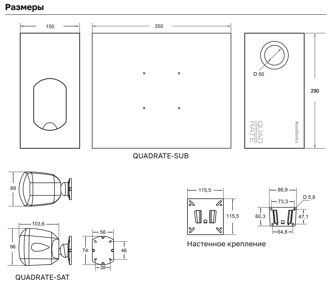 | Состав: | 1 сабвуфер QUADRATE SUB + 4 колонки-сателлита |