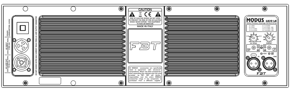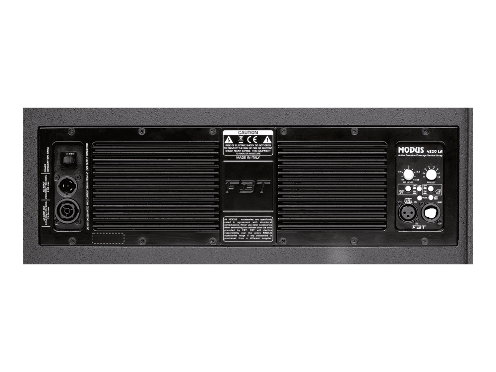 Оснащение MODUS 4820LA. Восемь (8) динамиков: 4 высокопроизводительных НЧ-вуфера диаметром 8" со звуковой катушкой 2" каждый и 4 компрессионных ВЧ-драйвера (B&C) диаметром 1,7" с неодимовым магнитом. Встроенный усилитель с топологией класса D обеспечивает bi-amp с мощностью RMS: 600 Вт для НЧ составляющей (пик 1200 Вт) и 300 Вт для ВЧ части (пик 600 Вт). Цифровой процессор обработки звука DSP с восемью пресетами; возможна регулировка громкости, ВЧ-эквалайзинг, подключение ФВЧ, активация лимитера и переключение GRND switch. Коннекторы: XLR with loop.