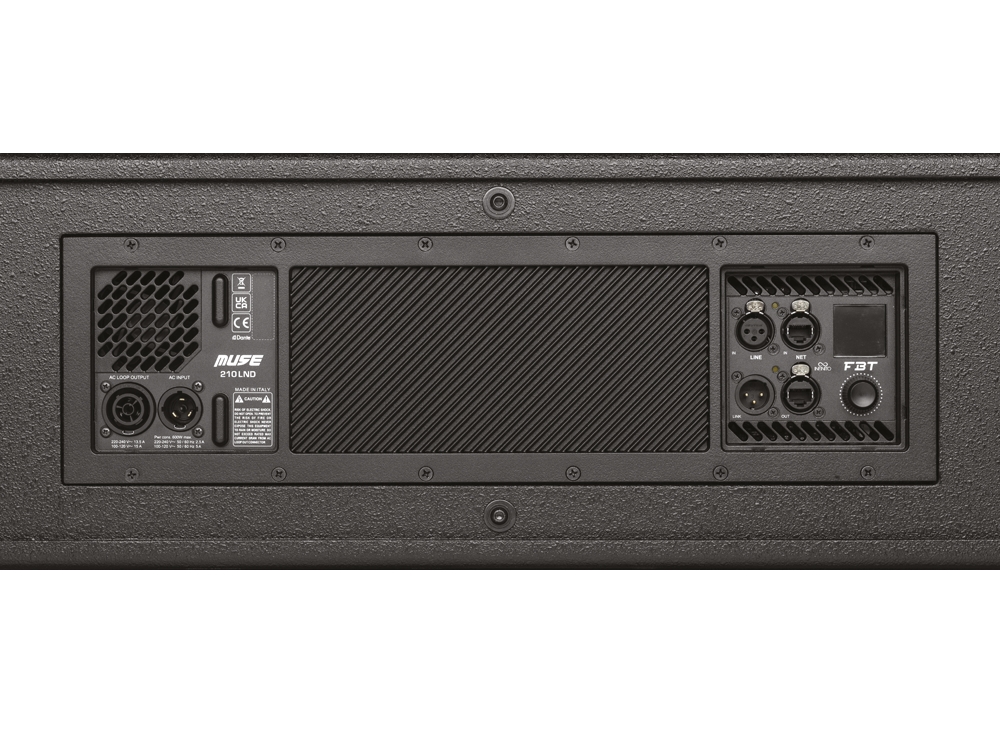 Оснащение MUSE 210LND. Четыре (4) динамика: 2 высокопроизводительных НЧ-вуфера диаметром 10" со звуковой катушкой 2.5" каждый и 2 компрессионных ВЧ-драйвера (B&C) диаметром 1,7". Встроенный усилитель с топологией класса D обеспечивает bi-amp с мощностью RMS: 800 Вт для НЧ составляющей (пик 1600 Вт) и 400 Вт для ВЧ части (пик 800 Вт). Цифровой процессор обработки звука DSP с предустановленной платформой Infinito: уникальное ПО разработанное командой FBT R&D с целью мониторинга всех подключённых в связку приборов в реальном времени, контроль за всеми их параметрами и совместное управление. Восемь пресетов; возможна регулировка громкости, ВЧ-эквалайзинг, подключение ФВЧ, активация лимитера и переключение GRND switch. Коннекторы: XLR with loop и Ethercon для подключения к сети. Особенностью модели является поддержка передачи данных по цифровому сетевому протоколу Dante.
