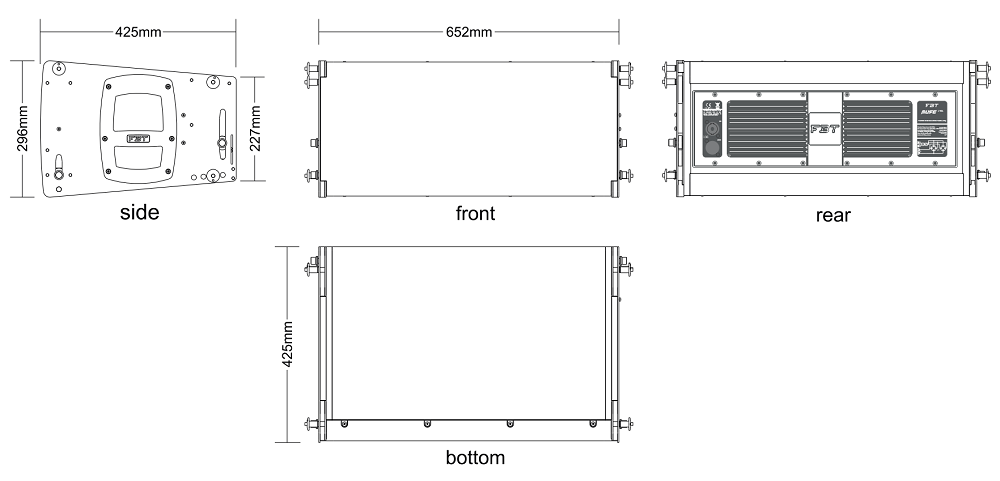 Легко объединяется в массив с указанными выше приборами. Предусмотрены разнообразные варианты монтажа: вертикальный подвес, друг на друга (в стек) на подставку или тележку, на акустическую стойку крепящуюся к сабвуферу.