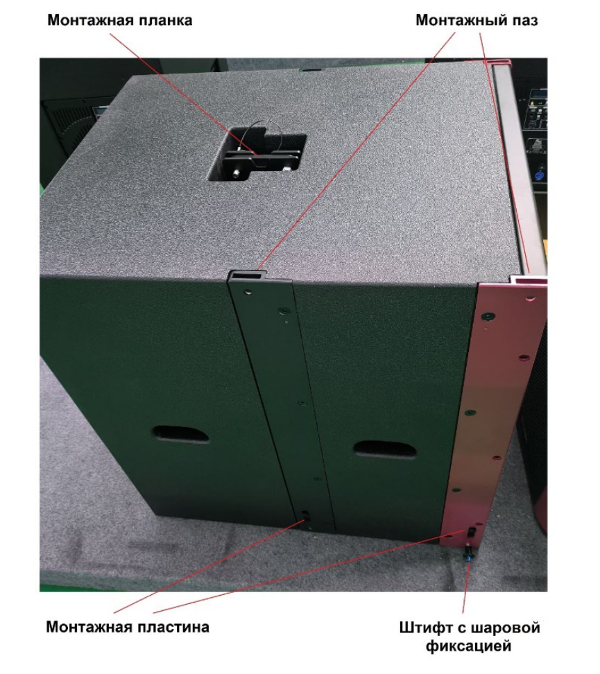 Корпус изготовлен из многослойной березовой фанеры с защитным покрытием полиуретаном, динамик защищен металлической сеткой. Черный цвет. Габаритные размеры 740х565х671 мм, вес 67 кг. Монтаж подвесной или напольный (в стек). Дополнительно на верхней части корпуса предусмотрено крепление акустической стойки. Для удобства совмещения между собой в корпус каждого элемента линейного массива интегрированы все необходимые металлические компоненты для подвеса и стековой (напольной) установки. Подвесная рама для всего массива приобретается отдельно.