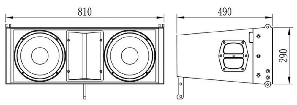 АС оснащена четырьмя (4) динамиками: ВЧ-драйверы 2х 1.34" и НЧ-вуферы 2х 10". Частотная характеристика воспроизводимых сигналов 60 Гц - 22 кГц (по уровню -10 дБ), максимальный уровень звукового давления SPL = 136 дБ. Диаграмма направленности с углами раскрытия 120°х10° (горизонталь Х вертикаль). Встроенный усилитель класса D, номинальная мощность (RMS) 1150 Вт, обеспечивает bi-amp усиление: 1000 Вт на НЧ + 150 Вт для ВЧ. Встроенный DSP позволяет настраивать следующие параметры: уровень усиления сигнала, задержка и порог, эквалайзинг и регулировка частоты кроссовера.