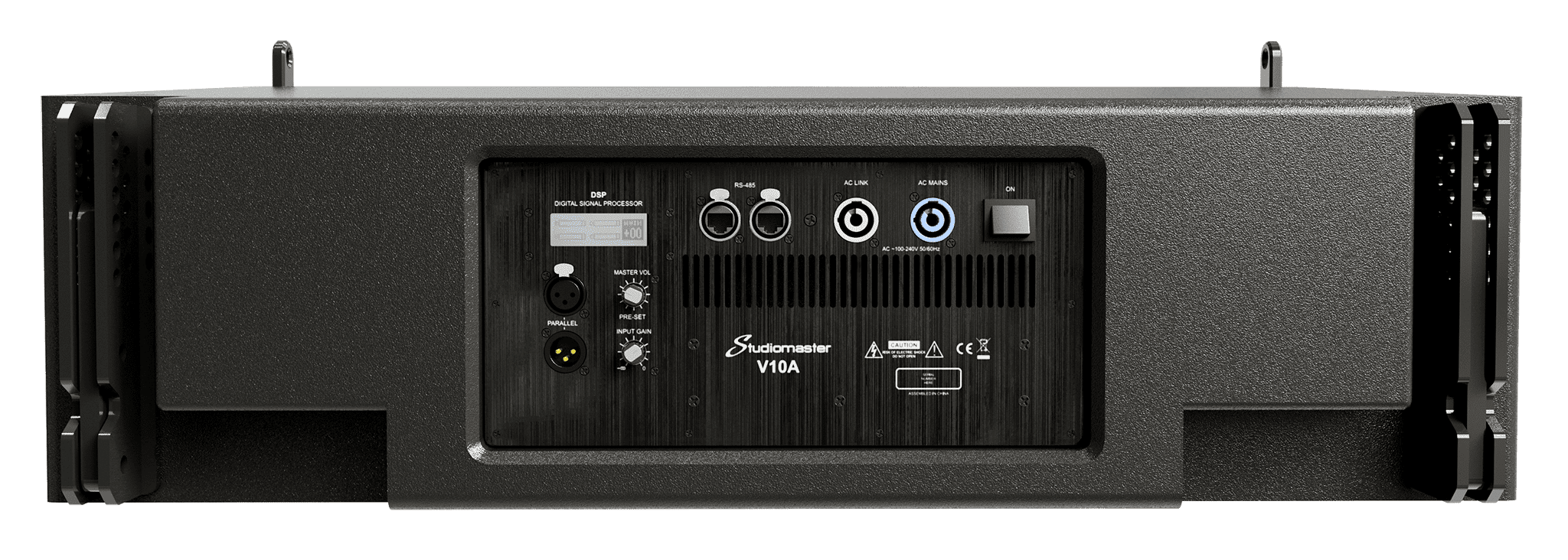 На тыльной части корпуса расположен дисплей и кнопки управления DSP, регулятор настройки громкости, а также коннекторы для подключения: аудиовходы Speakon и XLR + аудиовыходы на разъемах XLR. Также предусмотрены два цифровых разъема RJ-45 для интерфейса RS-485. Корпус V10A выполнен из многослойной фанеры, габаритные размеры 810х290х490 мм, вес 31 кг. Монтаж подвесной, на специальную раму, которая позволяет регулировать угол наклона АС в пределах 0-6° с шагом 1°. Черный цвет.
