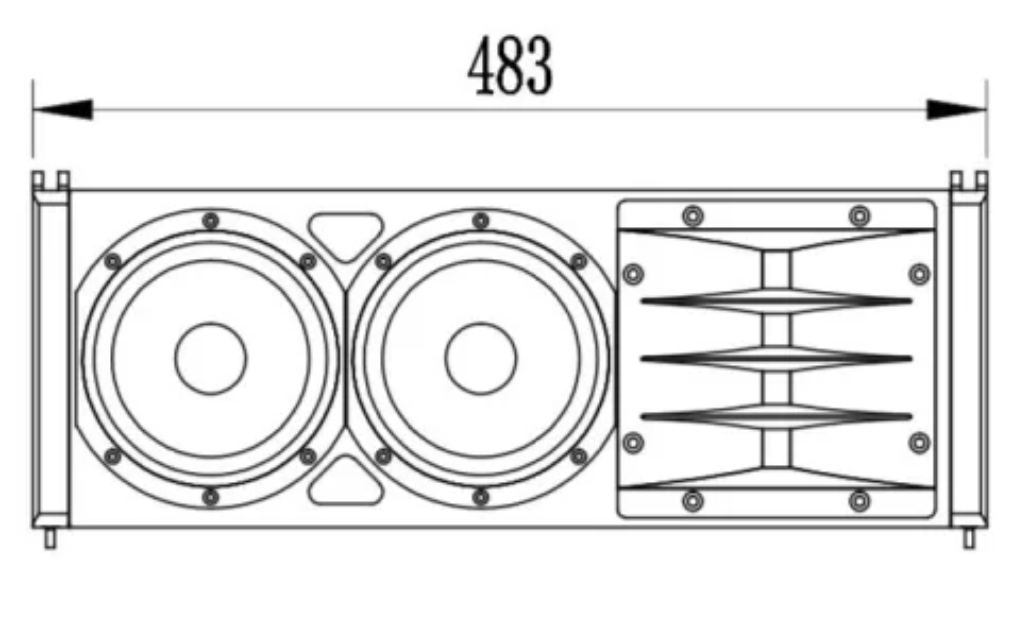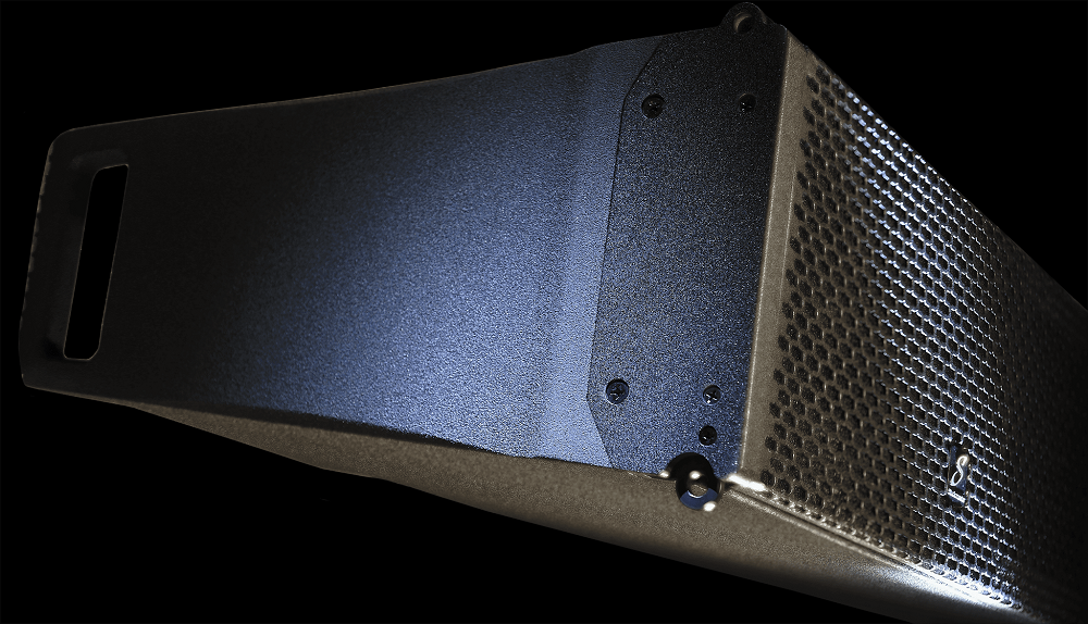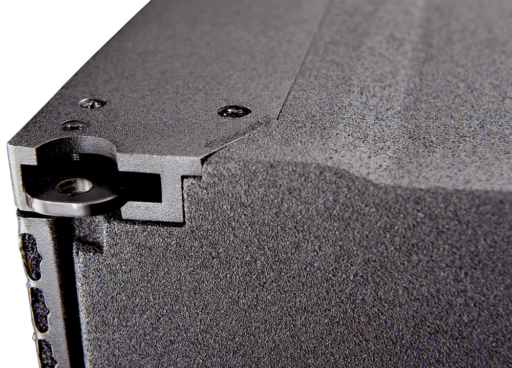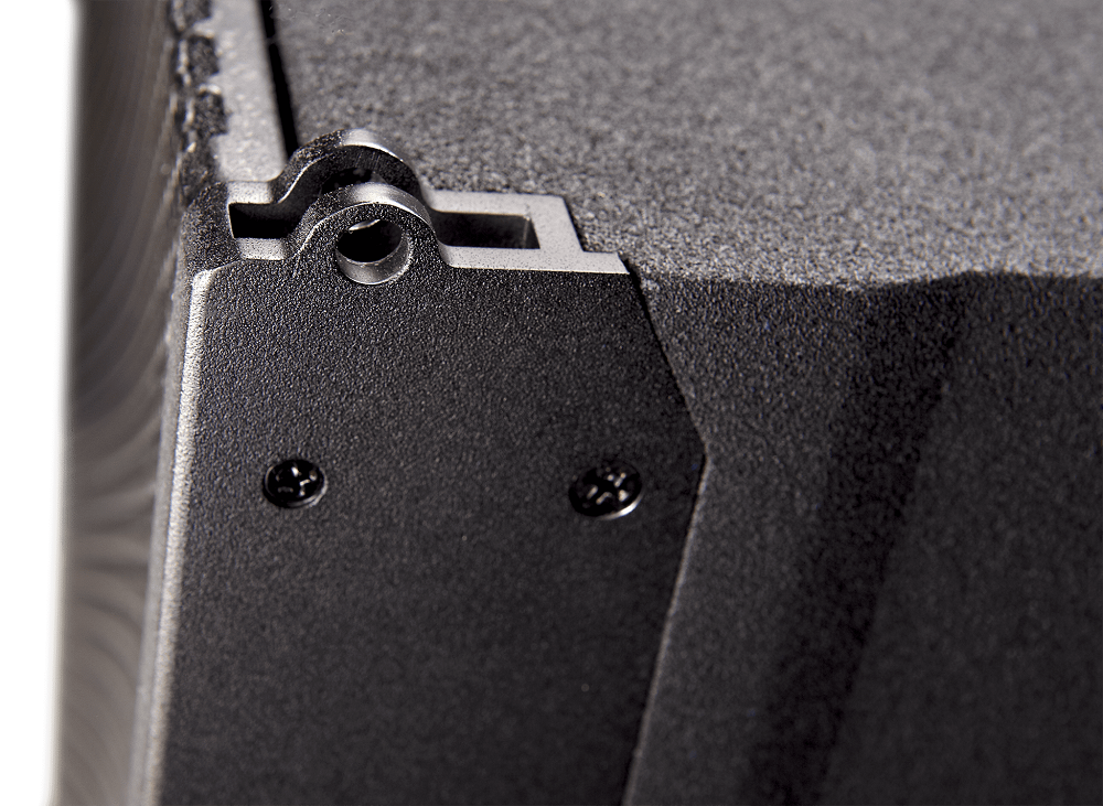 Для удобства совмещения элементов между собой корпус имеет трапециевидную форму. Выполнен из многослойной фанеры, динамики защищены мелкоячеистой стальной решеткой. Порошковый окрас в черный цвет. Габаритные размеры 486х171х351 мм, вес 11 кг. Монтаж подвесной, на специальную раму, которая позволяет регулировать угол наклона АС в пределах 0-10° с шагом 2°.