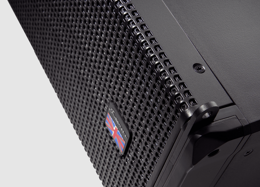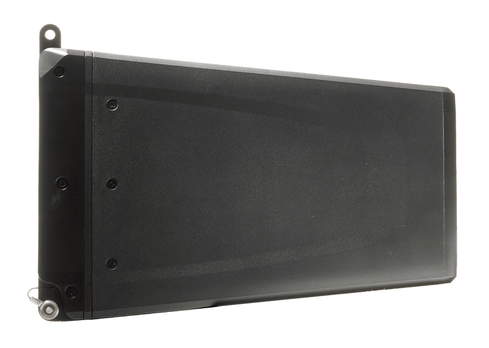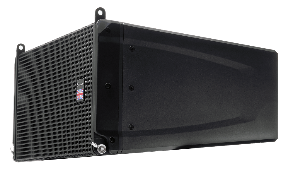Для удобства совмещения элементов между собой корпус имеет трапециевидную форму. Выполнен из композитного полипропилена, динамики защищены мелкоячеистой стальной решеткой. Порошковый окрас в черный цвет. Габаритные размеры 470x207x341 мм, вес 13 кг. Монтаж подвесной, на специальную раму, которая позволяет регулировать угол наклона АС в пределах 0-10° с шагом 1°.