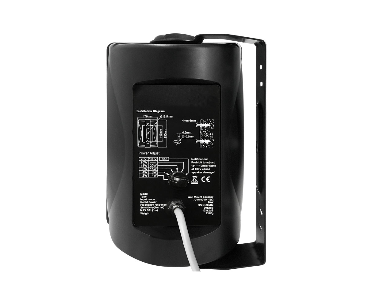 Акустическая система оснащена двумя (2) динамиками: высокочастотный (ВЧ) диаметром 1 дюйм и среднечастотный (СЧ) диаметром 4 дюйма. Диапазон воспроизводимых частот 95 Гц - 20 кГц, чувствительность 90 дБ, максимальный уровень звукового давления (SPL) = 103 дБ. Универсальный громкоговоритель, может применяться как в низкоомных линиях (импеданс 8 Ом), так и в трансляционных, с рабочим напряжением 70 или 100В. Мощность зависит от типа линии и выбирается селектором из следующих вариантов: импеданс 8 Ом, мощность = 20Вт; напряжение 70В, мощность = 2 / 4 / 8 / 15 / 20 Вт; напряжение 100В, мощность = 4 / 8 / 15 / 20 Вт. Подключение через надежный кабельный терминал, расположенный вместе с селектором на тыльной части корпуса.