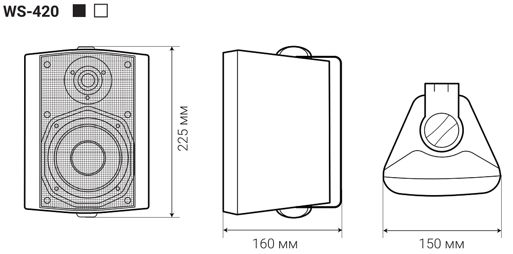 Корпус из ABS-пластика, динамик защищает мелкоячеистая стальная сетка. Габаритные размеры: 160х150х225 мм, вес 2.2 кг. Монтаж на штатный поворотный кронштейн, на стену вертикально или горизонтально, а также к потолку. Черный цвет.