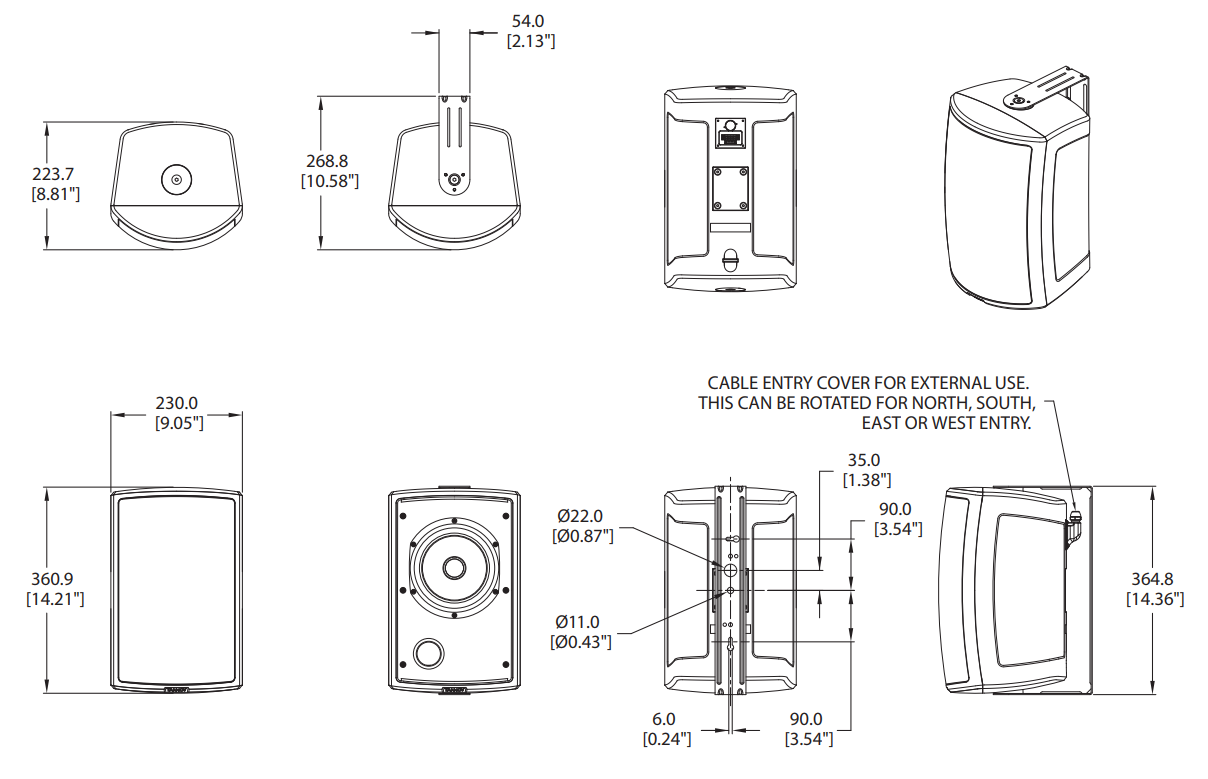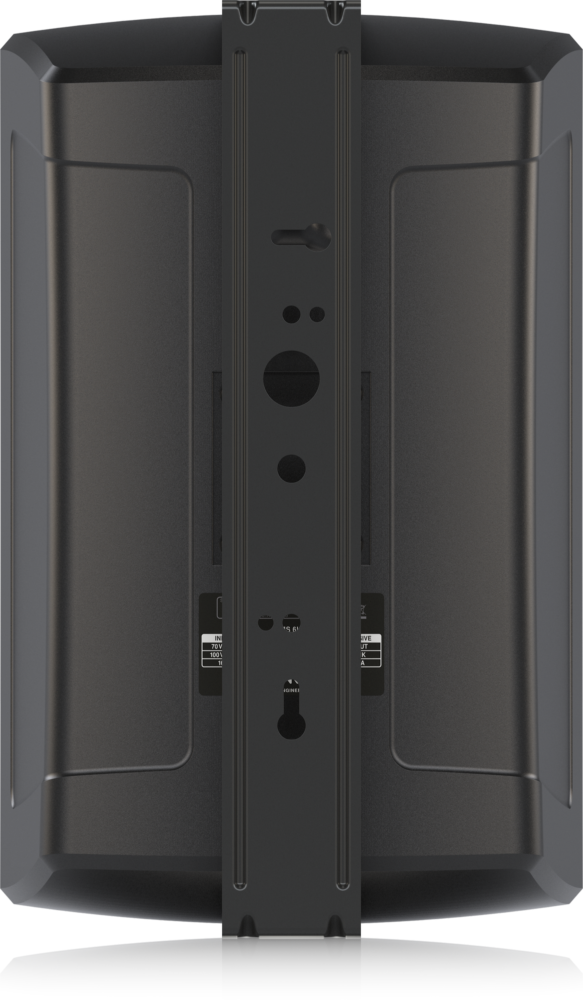 На задней панели также предусмотрен съёмный герметичный аудиоразъём на винтовых клеммах. Передняя часть АС защищена решёткой из стали покрытой порошковым окрасом. Корпус выполнен из всепогодного ABS-пластика, IP65. Габаритные размеры 365x230x269 мм, вес 5,25 кг. Монтаж настенный на кронштейн в комплекте. Цвет черный.