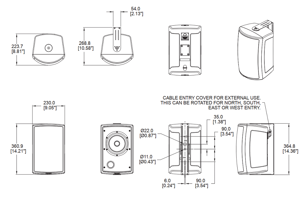 На задней панели также предусмотрен съёмный герметичный аудиоразъём на винтовых клеммах. Передняя часть АС защищена решёткой из стали покрытой порошковым окрасом. Корпус выполнен из всепогодного огнестойкого ABS-пластика (отвечает стандарту UL94 V-0), IP65. Габаритные размеры 365x230x269 мм, вес 5,4 кг. Монтаж настенный на кронштейн в комплекте. Цвет черный.