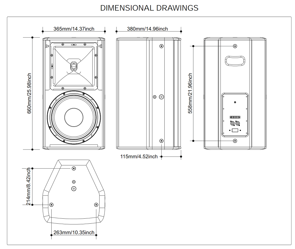АС подключается в низкоомные акустические линии с импедансом 8 Ом (опционально можно докупить трансформатор для линий 100В). Программная мощность составляет 1000 Вт, продолжительная 500, а пиковая 2000 Вт. На тыльной части АС расположены коннекторы типа Euroblock 4-pin и Neutrik Speakon (2 шт). Корпус из фанеры балтийской березы толщиной 15 мм, стальная решетка с порошковым окрасом защищает лицевую часть. Габаритные размеры 365х660х380 мм, вес 22 кг. Монтаж настенный, для чего предусмотрены 12 резьбовых точки М10 или в стойку 35 мм (есть адаптер). Черный цвет.