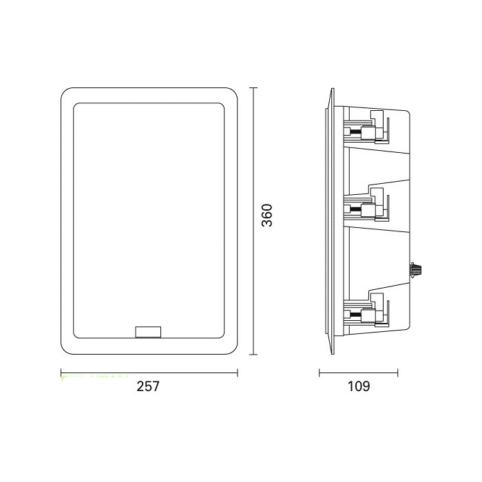 Корпус из пластика, стальная решетка с порошковым окрасом в бежевый цвет защищает лицевую часть. Габаритные размеры 360х257х109 мм, вес 3 кг. Монтаж врезной.