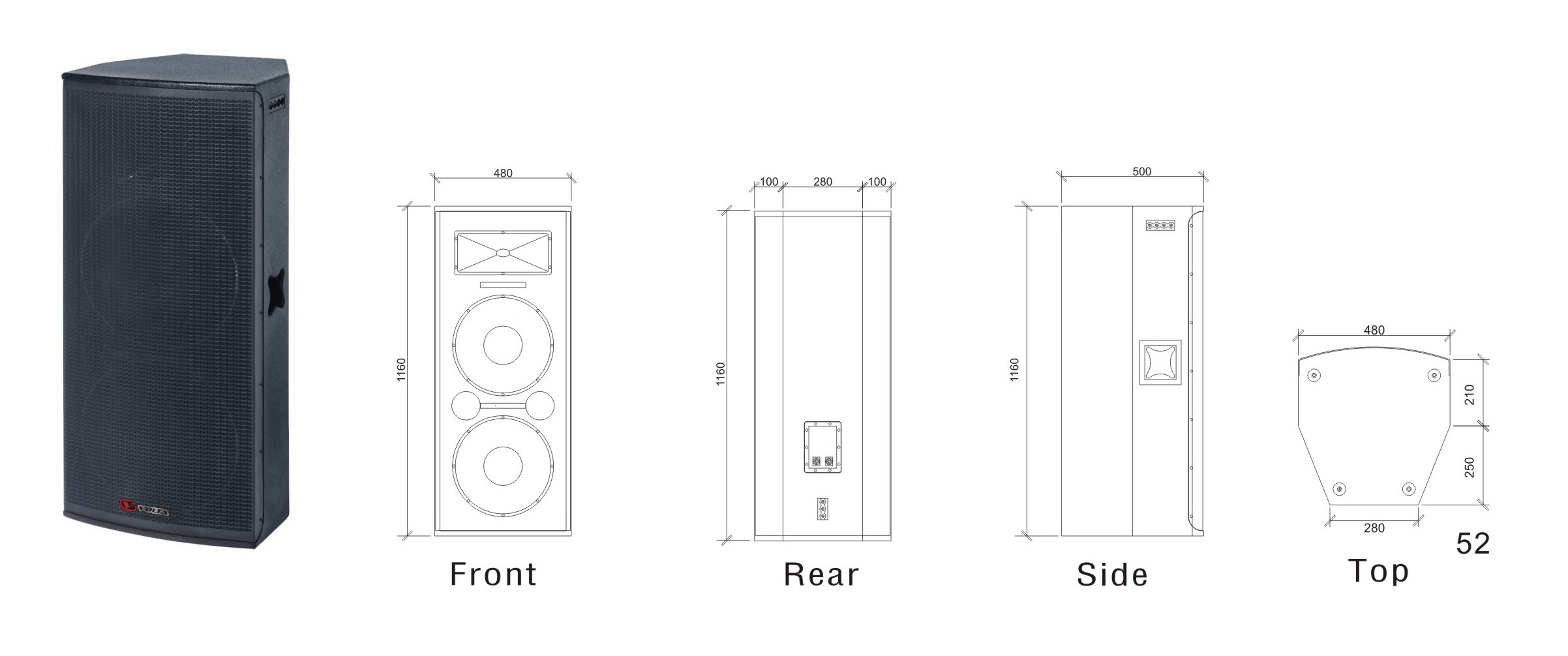 Акустика оснащена тремя (3) динамиками: ВЧ-драйвер 2" и два НЧ-вуфера 2х 15". Импеданс 4 Ом, мощность 1000 Вт (пиковая 2000 Вт в течение 5 минут), работает совместно с низкоомными усилителями. Частотная характеристика воспроизводимых сигналов 50 Гц - 20 кГц, частота раздела кроссовера 1,5 кГц, уровень звукового давления SPL = 131 дБ. Диаграмма направленности имеет углы раскрытия 90° х 60° (горизонталь х вертикаль). На тыльной части расположены аудиовходы 2х Speakon 4-pin.