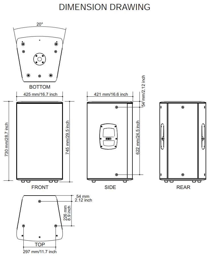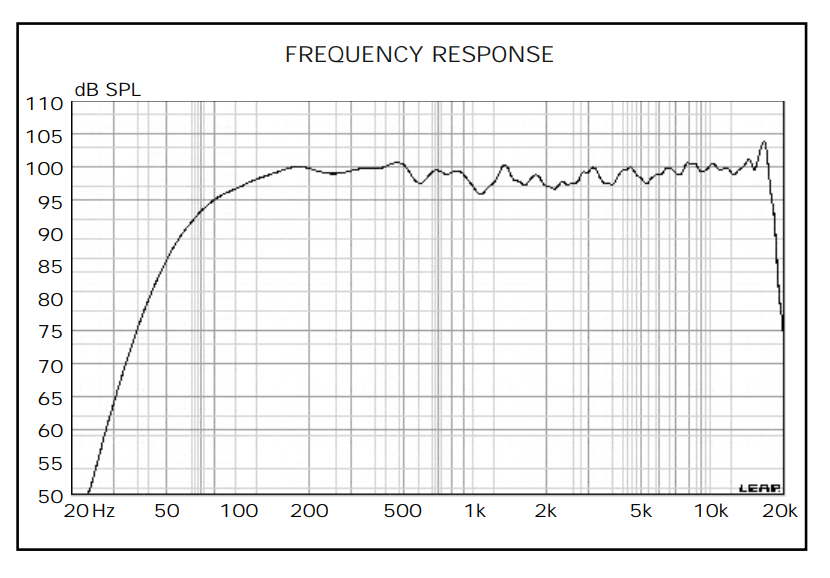 Оснащена двумя (2) динамиками: ВЧ-драйвер с неодимовым магнитом диаметром 1,7" (B&C custom) и НЧ-вуфер с неодимовым магнитом диаметром пятнадцать дюймов (15") со звуковой катушкой 3" (B&C custom).