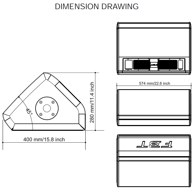 Корпус выполнен из многослойной березовой фанеры, стальная решетка защищает динамики. На тыльной стороне расположена панель с разъёмами: 2х Speacon NL4 & link. Габаритные размеры 574х290х402 мм, вес 17 кг. Монтаж напольный или на акустические стойки, для чего есть крепление 35 мм. Для переноса предусмотрены ручки. Черный цвет.