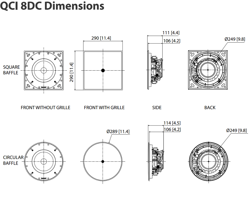 Акустическая система QCI 8DC эксплуатируется в низкоомных линиях с импедансом 8 Ом. Программная мощность равна 160 Вт, продолжительная 80 Вт, а пиковая 320 Вт. На задней панели блок аудиоразъёмов Phoenix. Жёсткий корпус выполнен из ABS-пластика, передняя часть надёжно защищена от пыли решёткой из стали с порошковым нанесением и возможностью покраски в любой цвет, требуемый для конкретного интерьера. В комплекте два варианта решёток - круглой и квадратной формы. Без задней крышки.