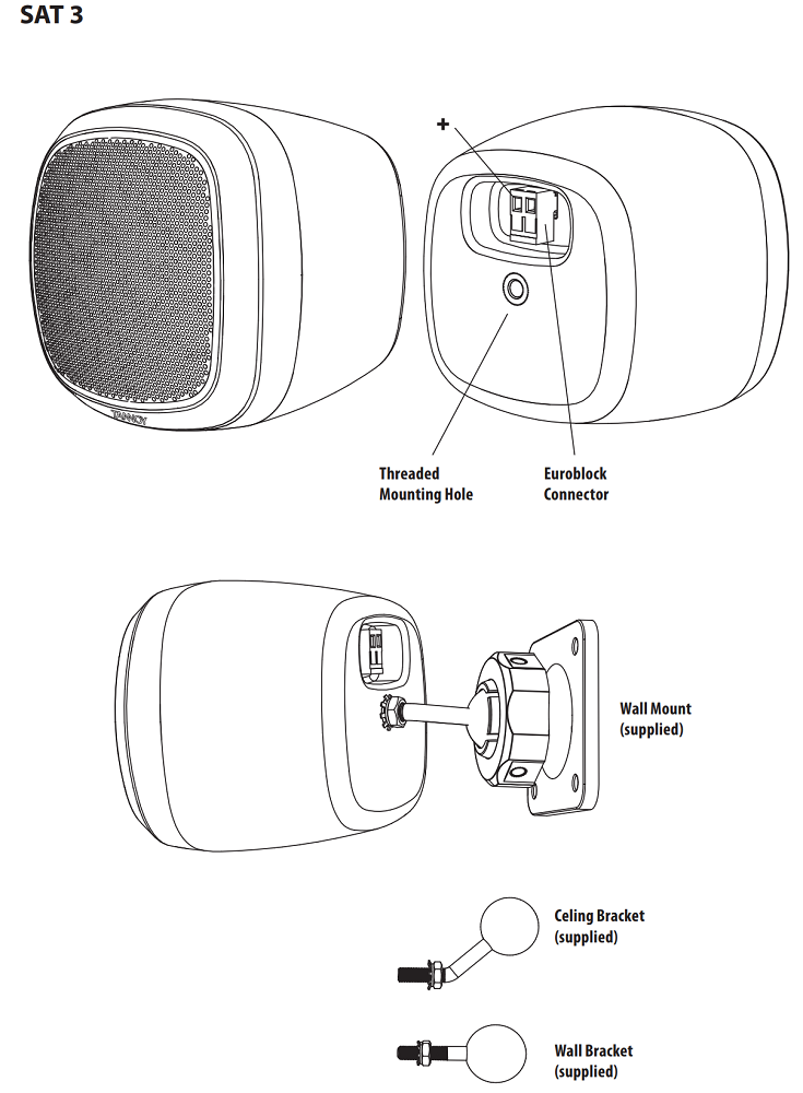 Акустическая система SAT 3 эксплуатируется в низкоомных линиях с импедансом 16 Ом. Программная мощность равна 25 Вт, средняя 15 Вт, а пиковая 50 Вт. На задней части АС размещён блок клеммных аудиоразъёмов типа Phoenix. Корпус выполнен из ABS-пластика, передняя часть защищена решеткой из стали.