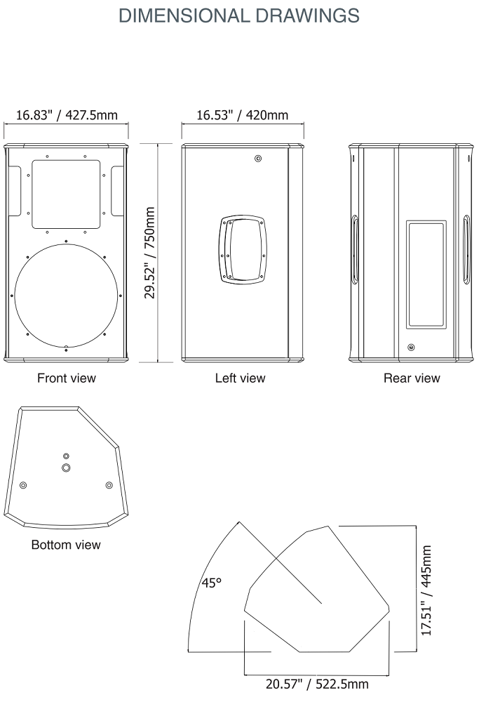 Габаритные размеры 427x765x420 мм, вес 24,5 кг. Монтаж настенный (точки крепления М10 или кронштейн) или напольный, включая положение "на бок" (под углом 45°, сценический монитор). Для переноса предусмотрены ручки. Черный цвет.