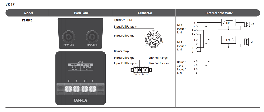 Акустическая система VX 12 эксплуатируется в низкоомных линиях с импедансом 8 Ом. Программная мощность равна 400 Вт, продолжительная 200 Вт, а пиковая 800 Вт. Аудиовходы представлены двумя типами: 2x Neutrik speakON NL4 и 1x клеммник с изолирующими перегородками.