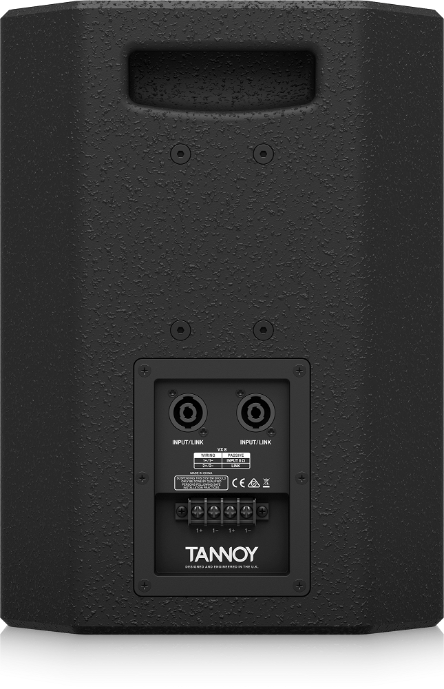 Акустическая система VX 8 эксплуатируется в низкоомных линиях с импедансом 8 Ом. Программная мощность равна 260 Вт, продолжительная 130 Вт, а пиковая 520 Вт. Аудиовходы представлены двумя типами: 2x Neutrik speakON NL4 и 1x клеммник с изолирующими перегородками.